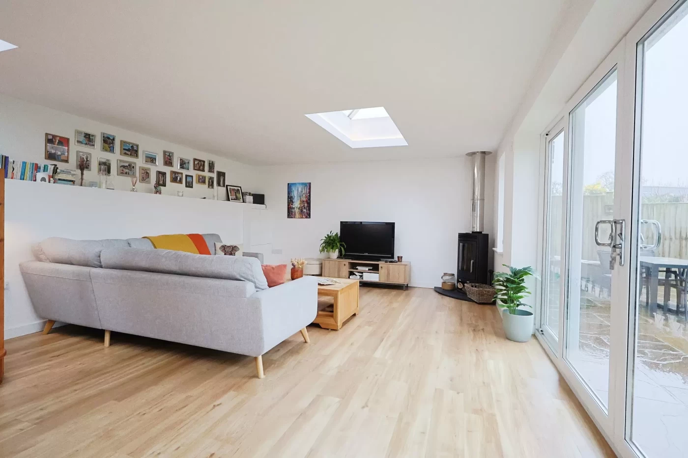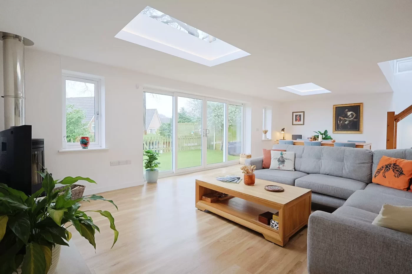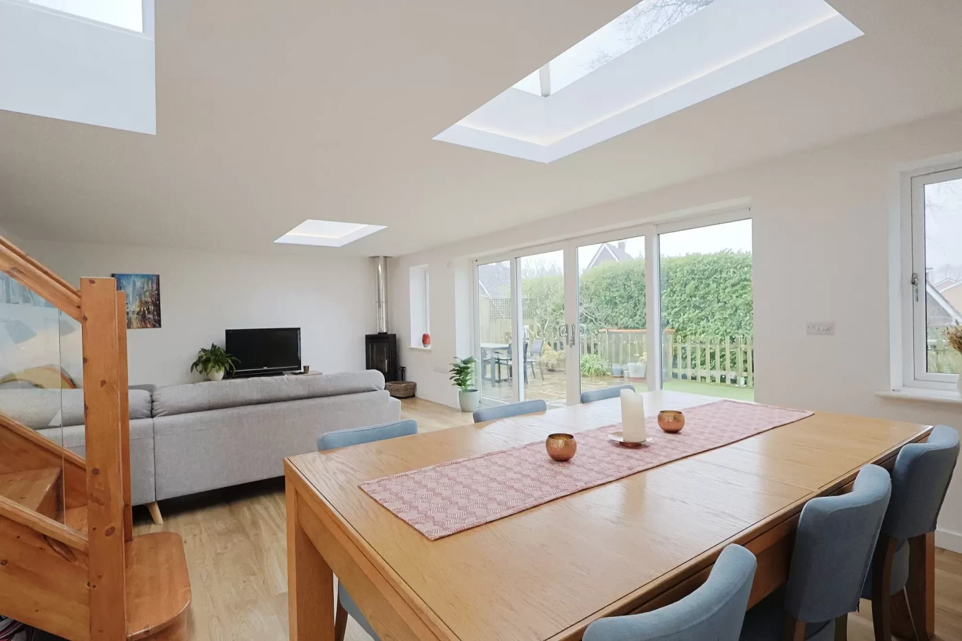 From the breakfast area, steps lead down to a superb sitting/dining room featuring two lantern skylights that flood the room with natural light, sliding patio doors opening onto the garden, a wood burner and underfloor heating (central heating), creating a warm and inviting environment throughout the year.