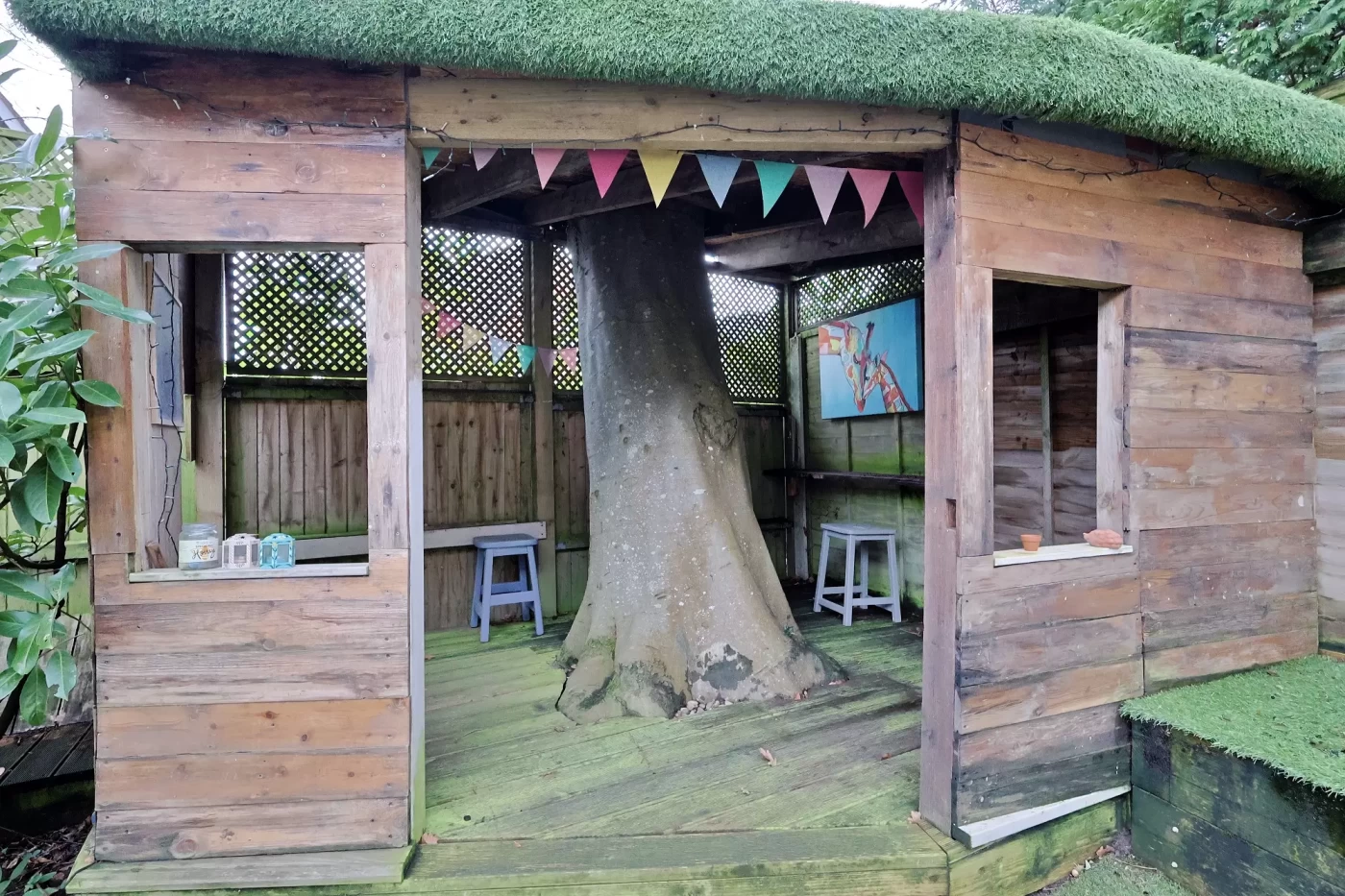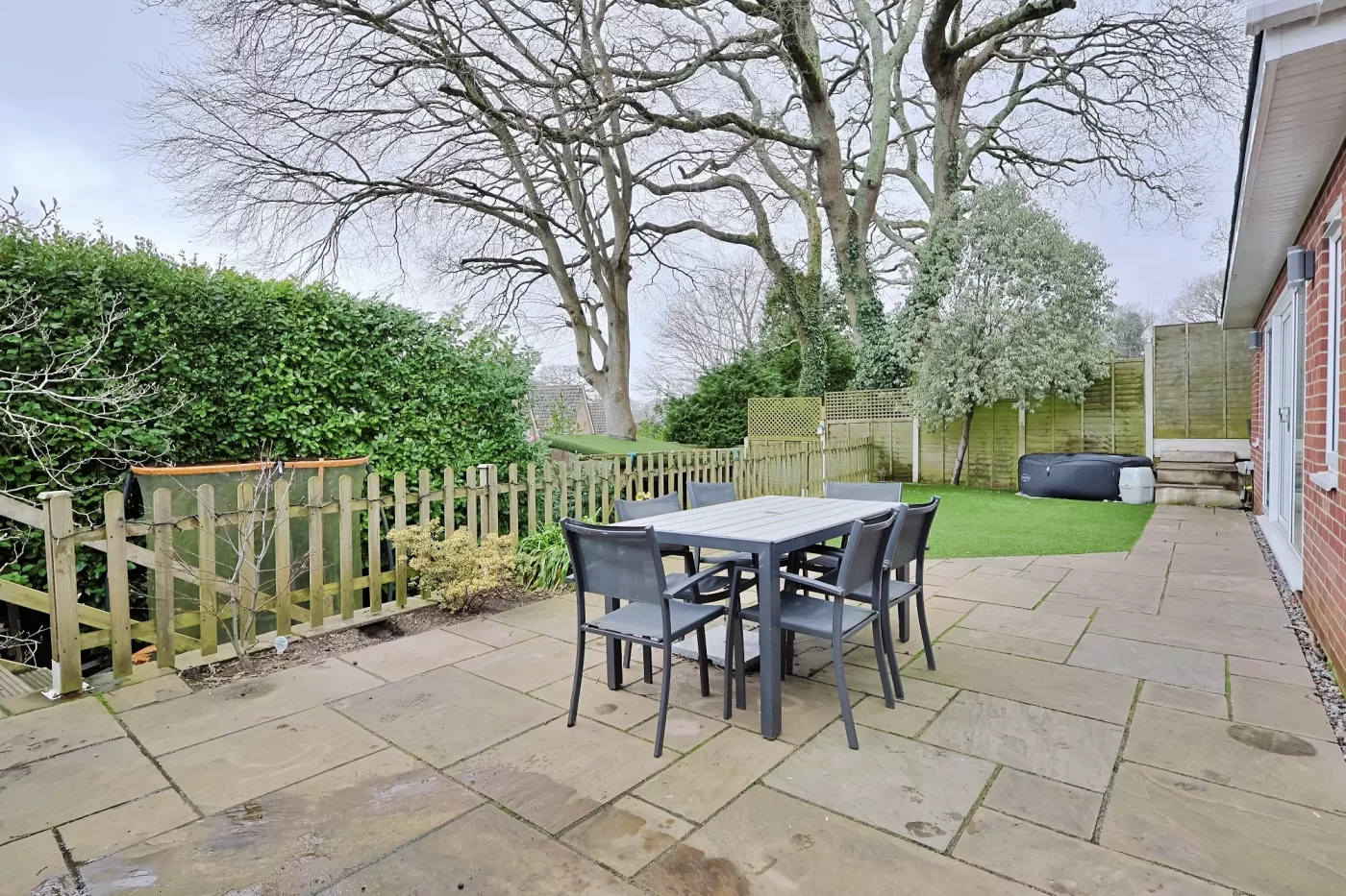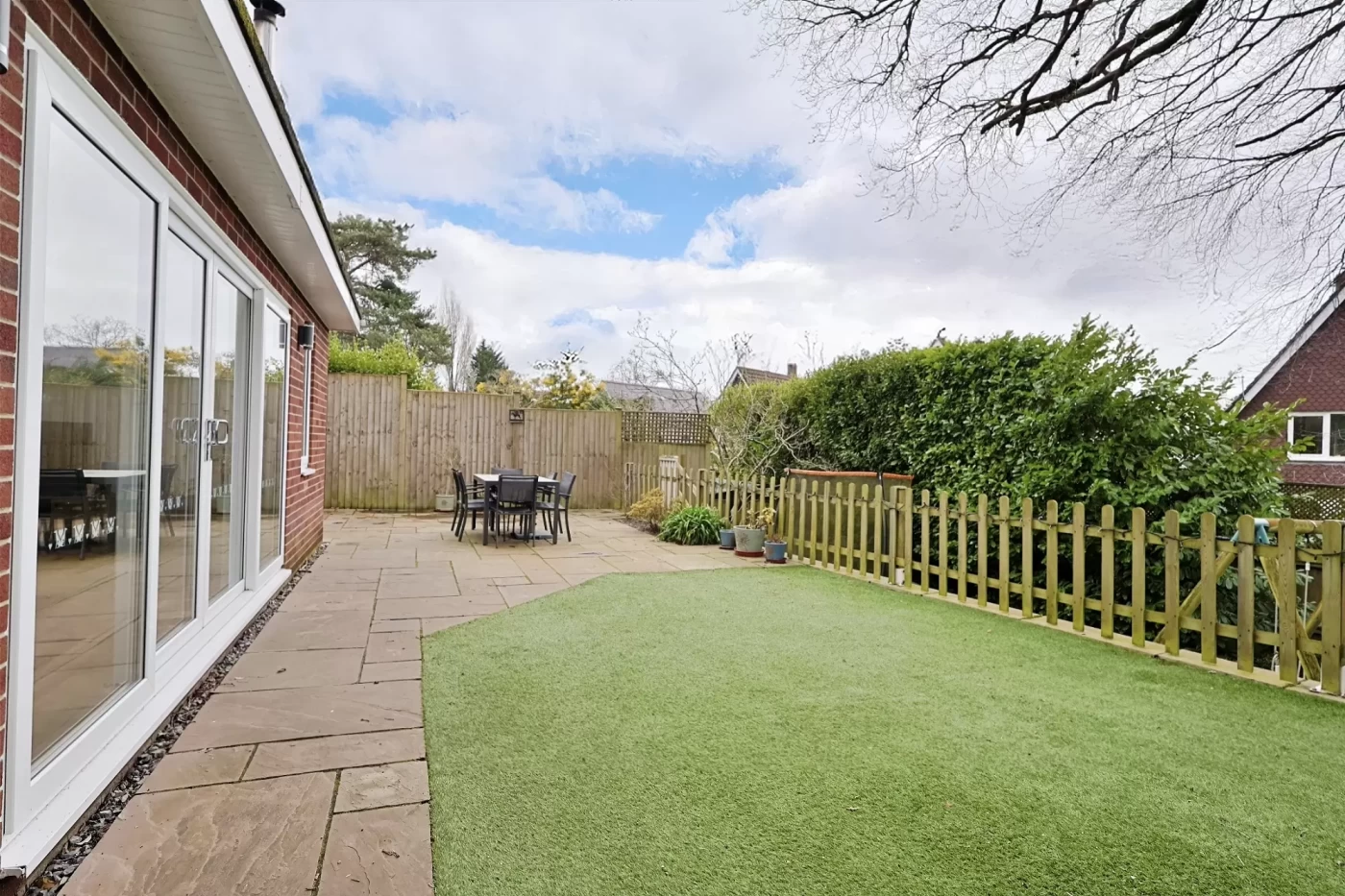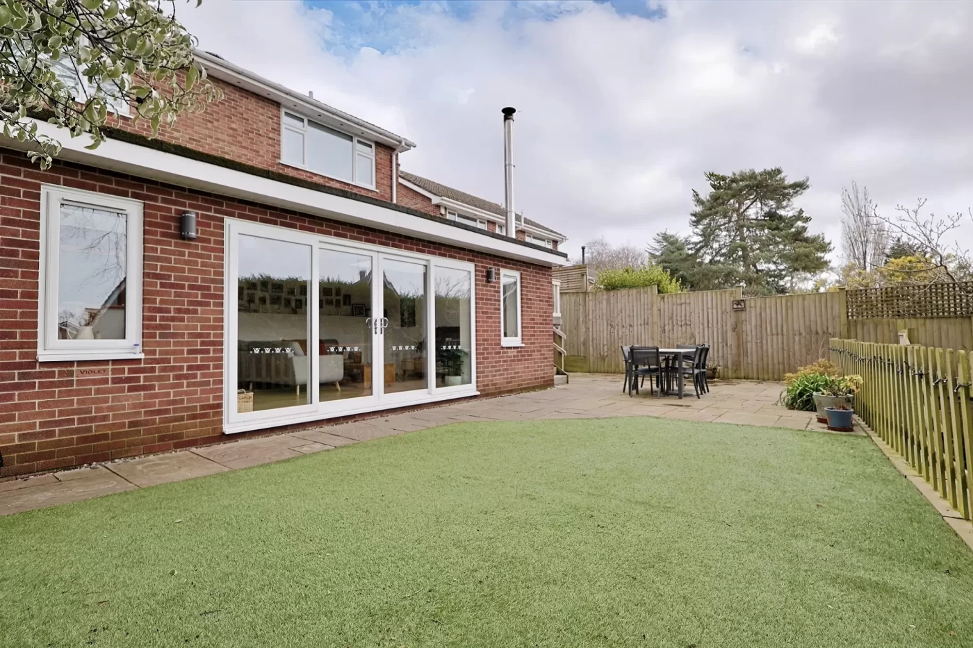 The landscaped rear garden is arranged over two levels. Immediately adjoining the house is a spacious patio with artificial lawn, outside lighting and useful outdoor storage. Steps lead down to a further area of artificial lawn, ideal as a children’s play area and complete with a garden den.