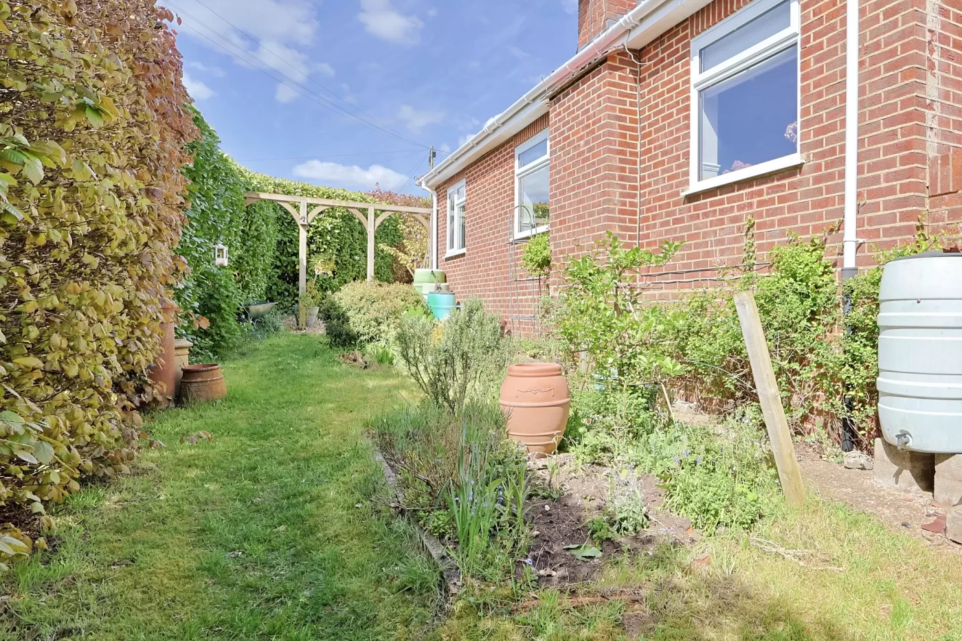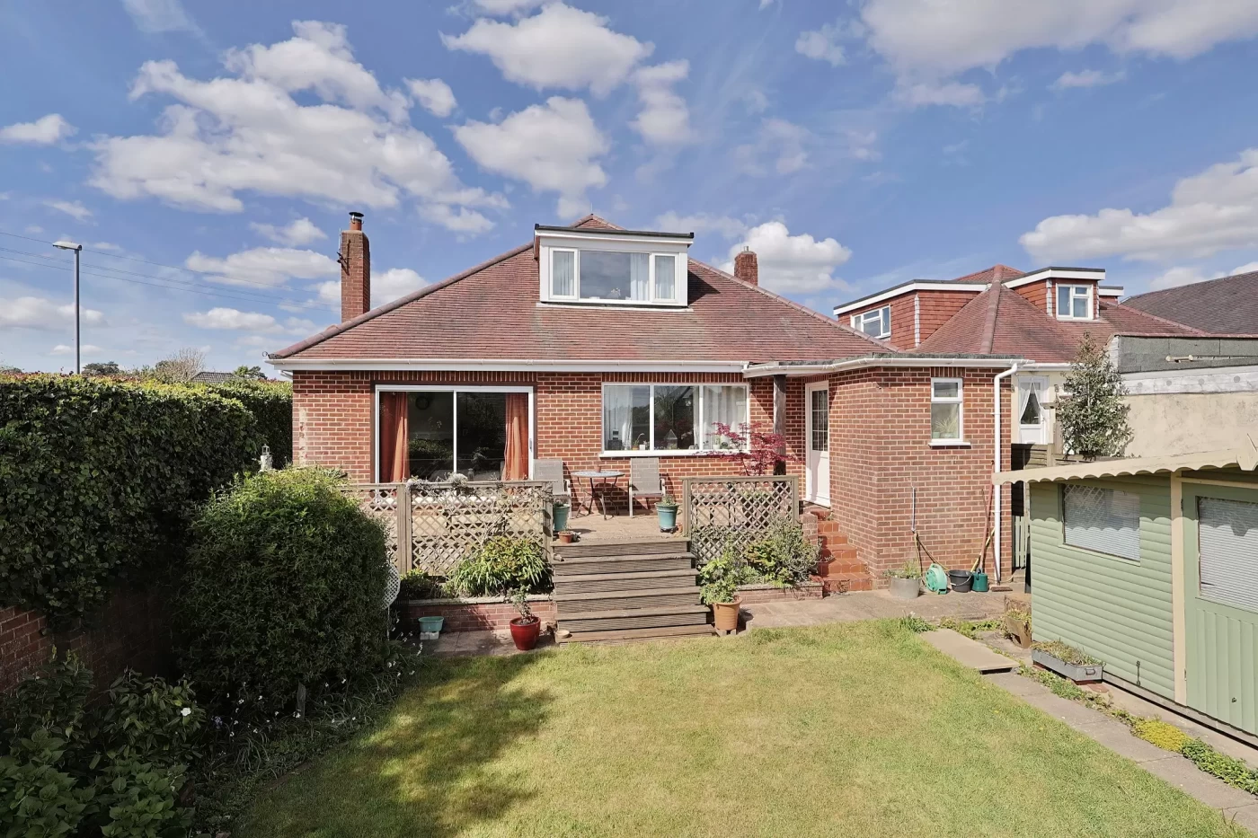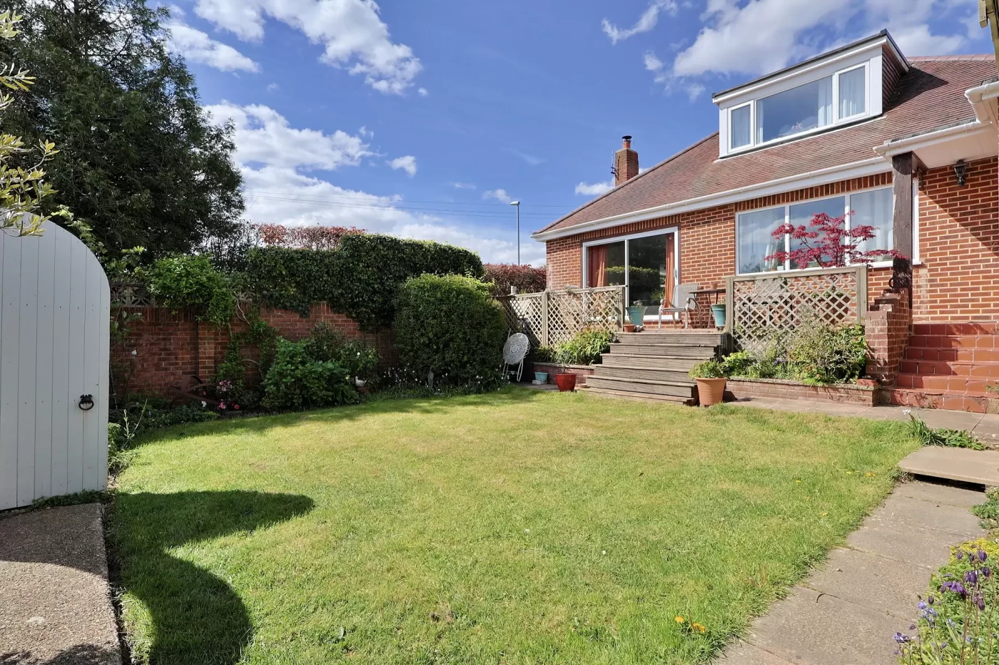 A lawned side garden with established planting adds further outdoor space. The rear garden is a delightful walled area, thoughtfully landscaped with a raised deck adjoining the house, a lawn, planted borders, and a substantial timber garden room (4.85m x 2.39m) ideal for a home office, studio, or entertaining space.