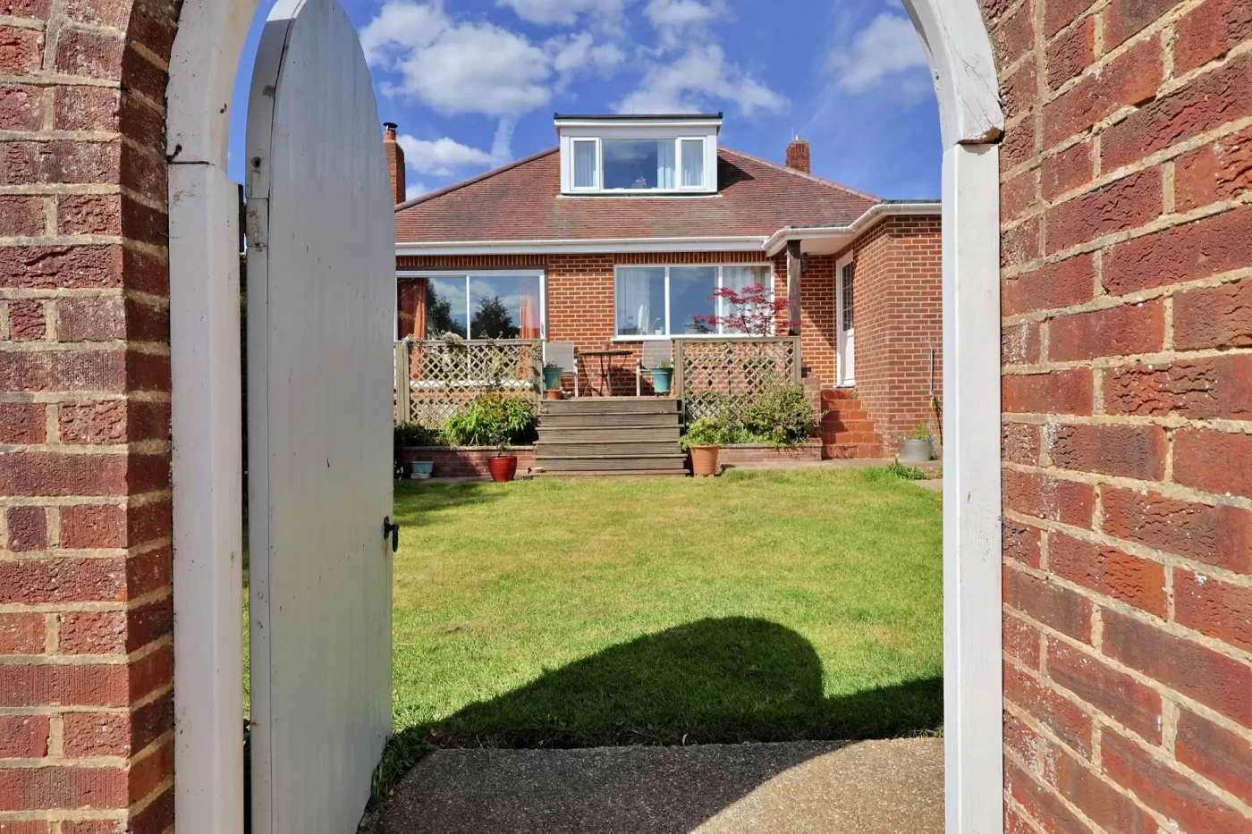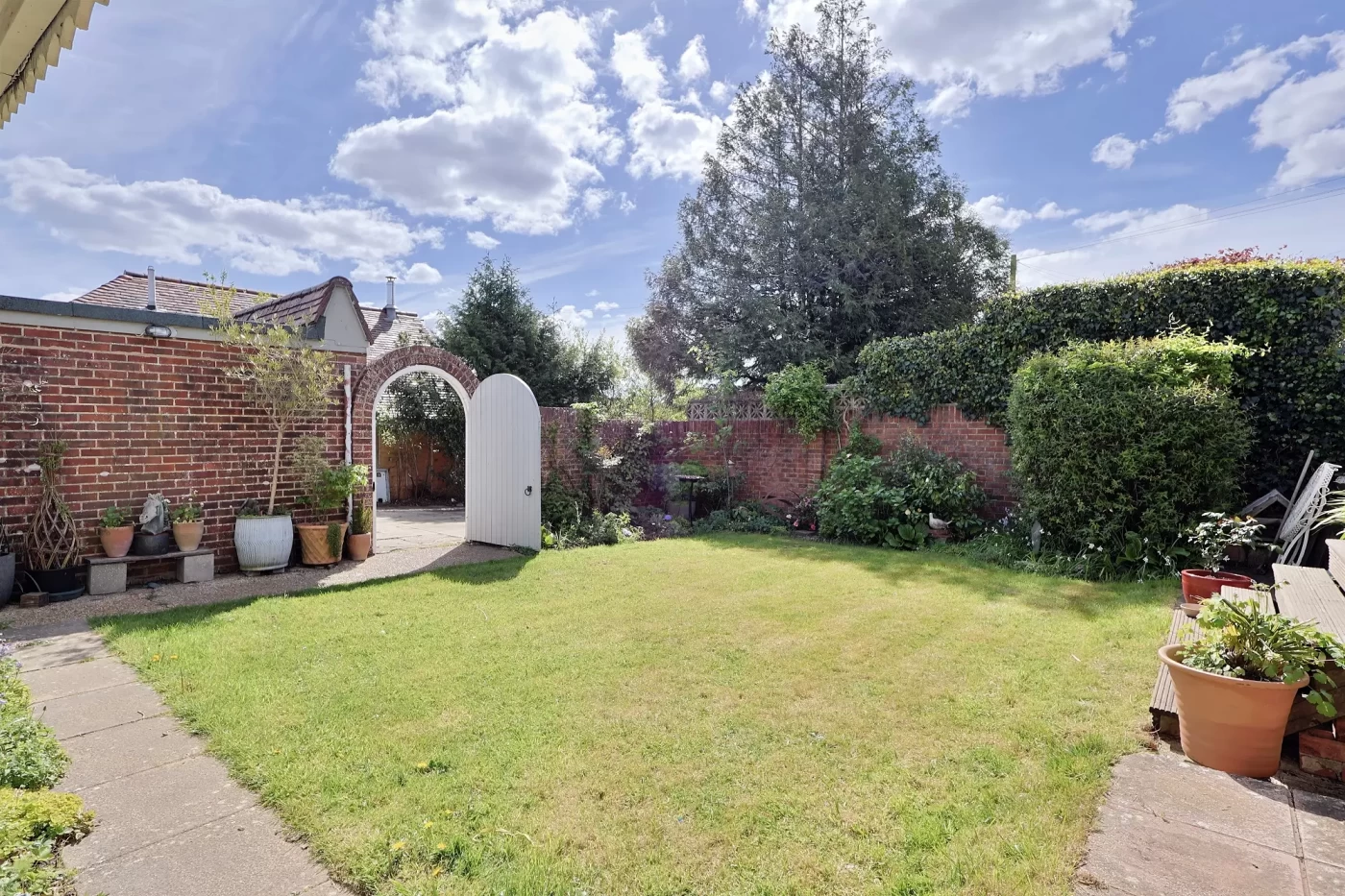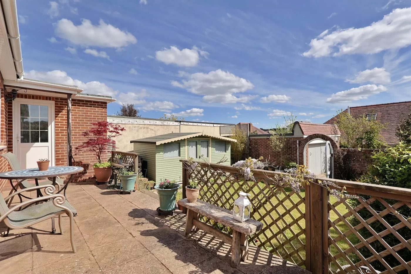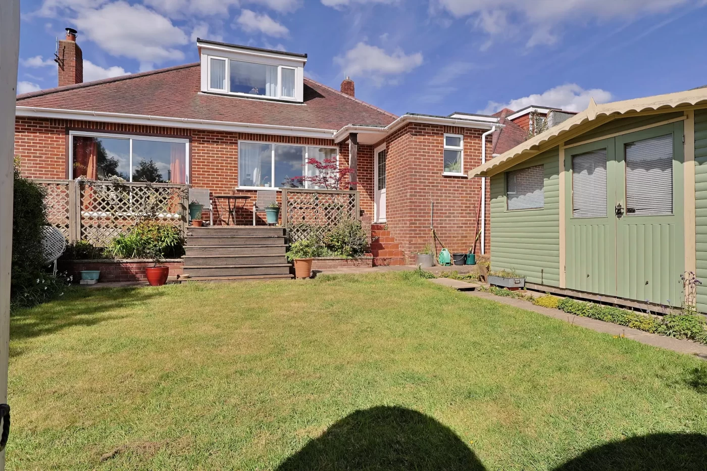 A lawned side garden with established planting adds further outdoor space. The rear garden is a delightful walled area, thoughtfully landscaped with a raised deck adjoining the house, a lawn, planted borders, and a substantial timber garden room (4.85m x 2.39m) ideal for a home office, studio, or entertaining space.