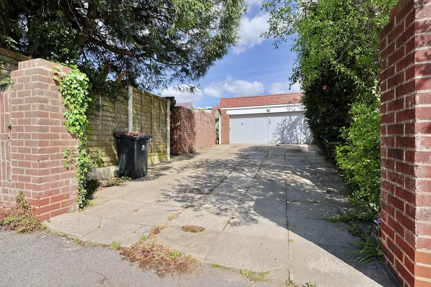 To the rear of the plot, a driveway provides off-road parking for several vehicles and leads to a detached garage with power and lighting.