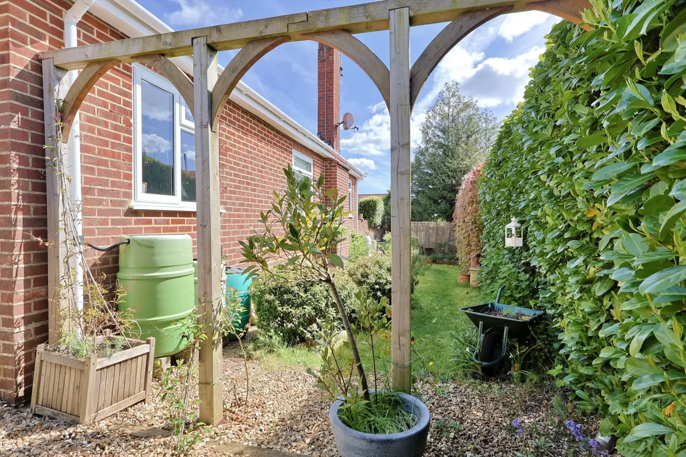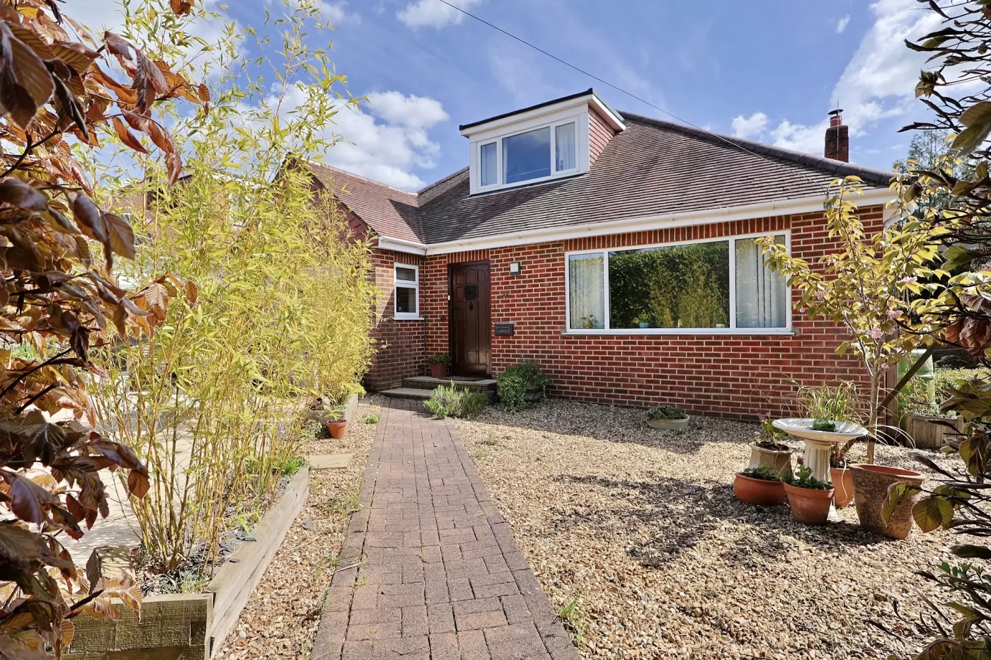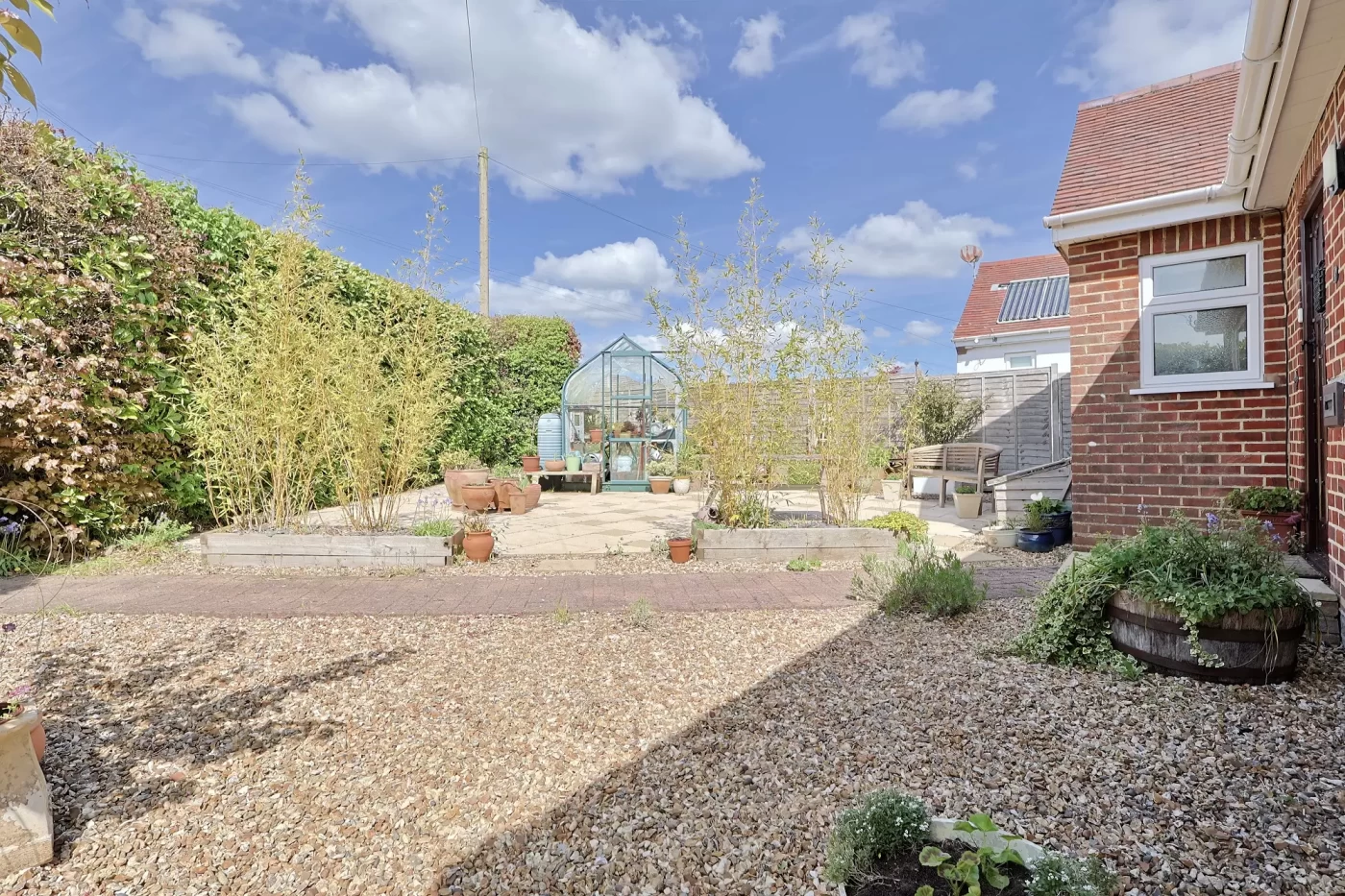 Externally, the property enjoys a generous and private corner plot. To the front, a secluded westerly-facing garden is predominantly laid to patio and shingle, ideal for enjoying afternoon and evening sunshine.