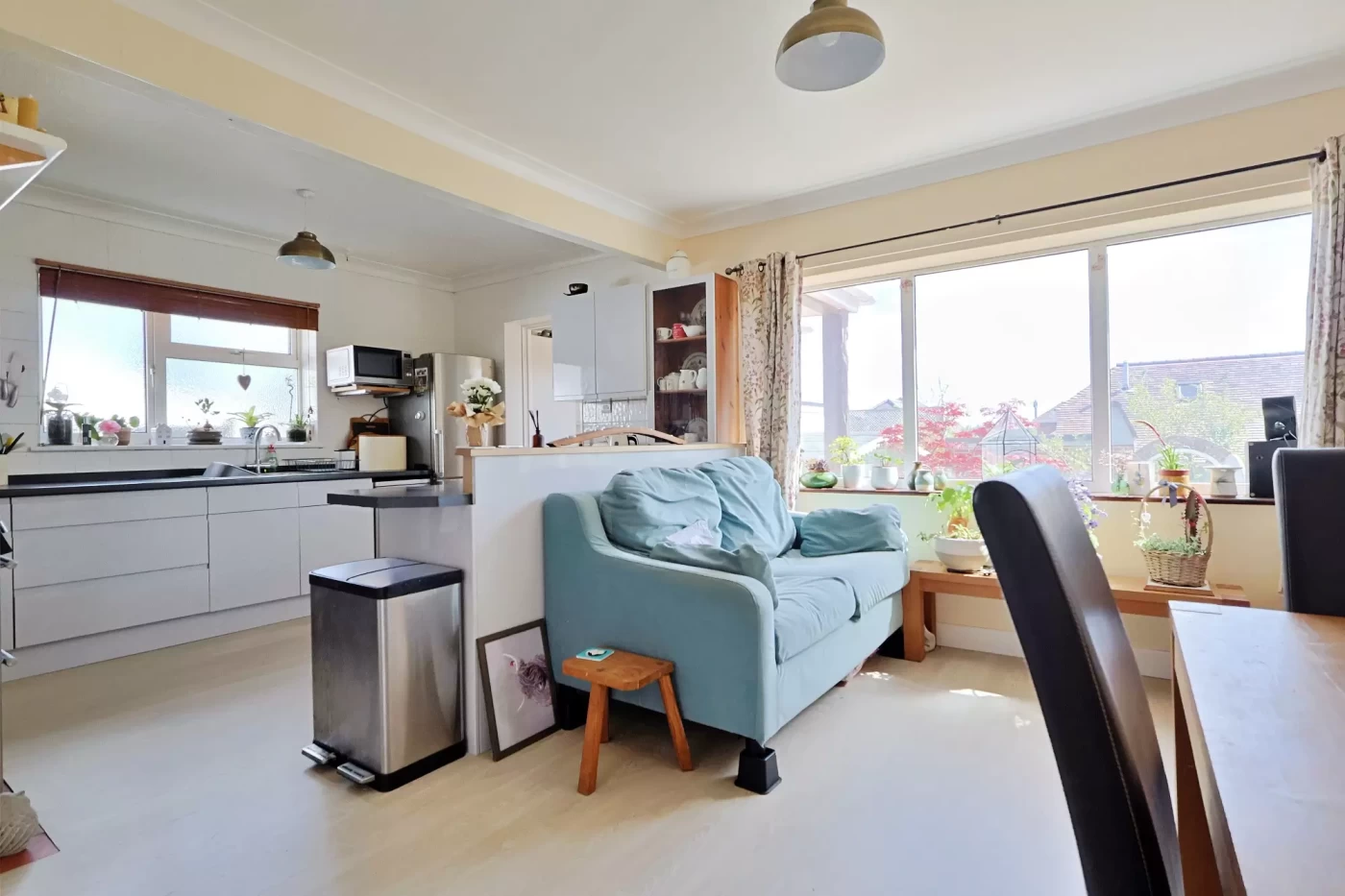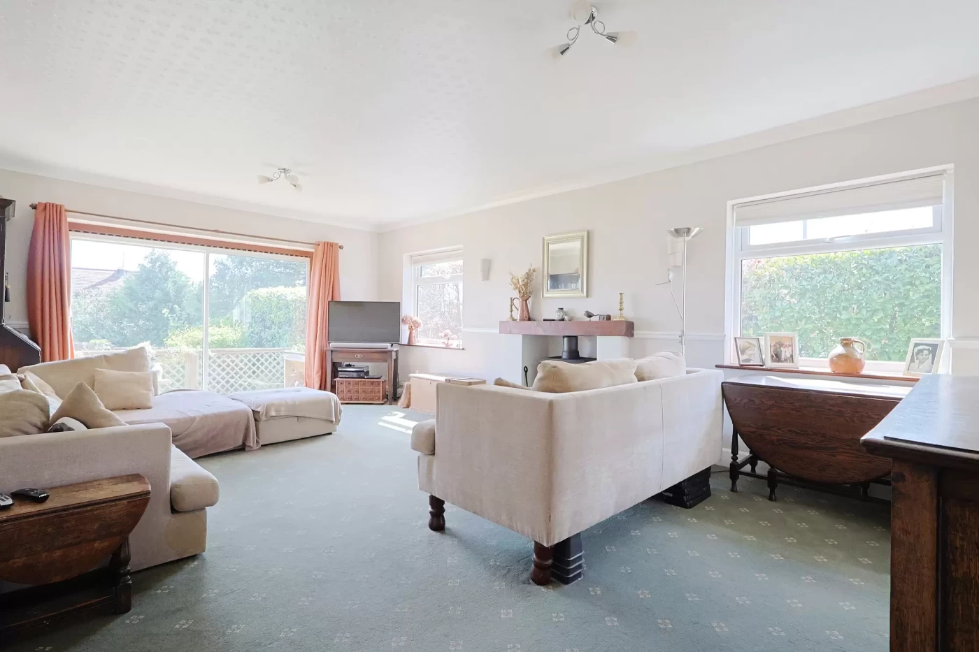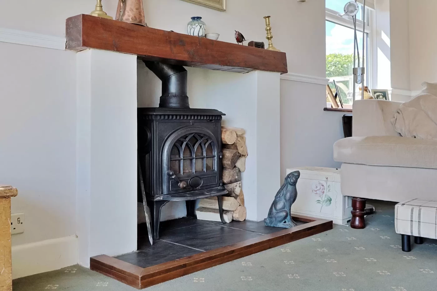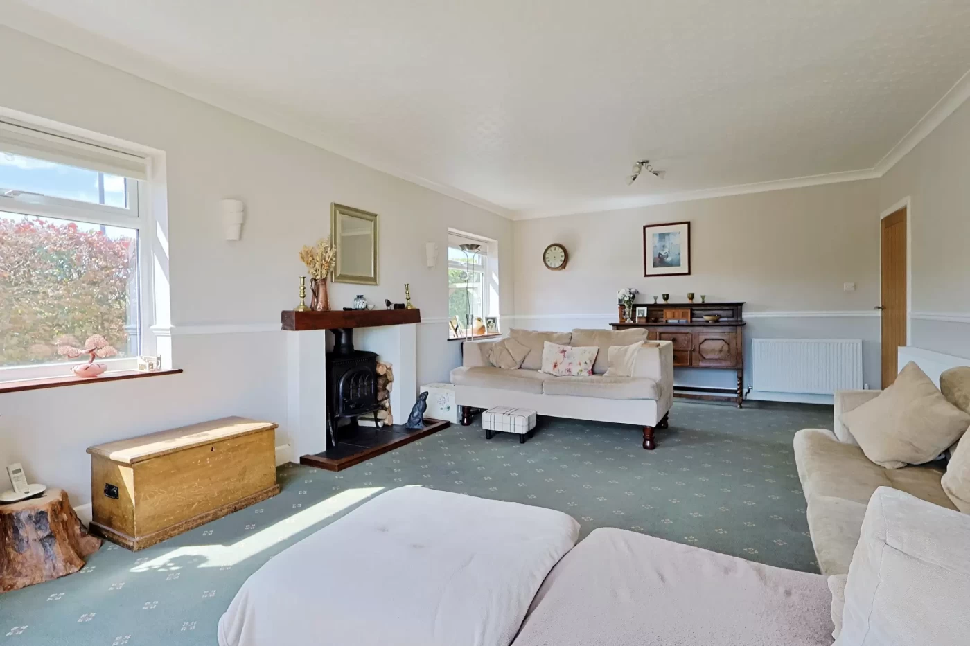 The principal living accommodation includes a spacious dual-aspect sitting room, filled with natural light and enjoying direct access to the garden via sliding patio doors. A feature fireplace with wood-burning stove provides a focal point, creating a warm and inviting space.