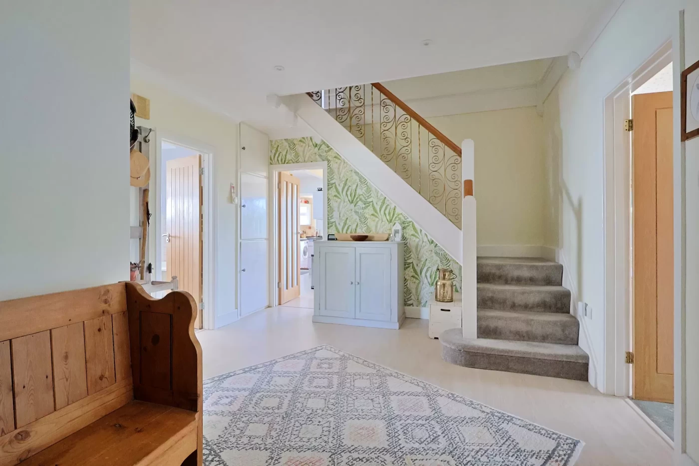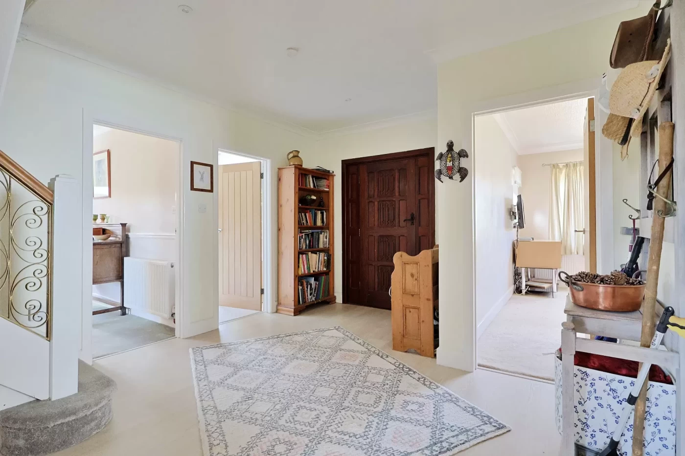 The property is entered via an entrance hall which opens into a large and welcoming reception hall, featuring a built-in airing cupboard and staircase rising to the first floor.