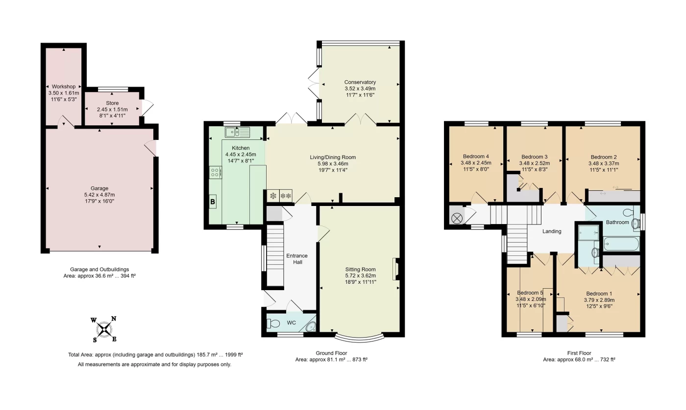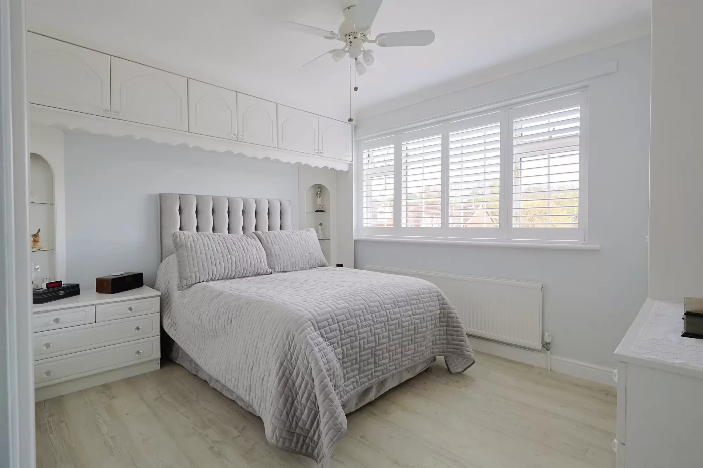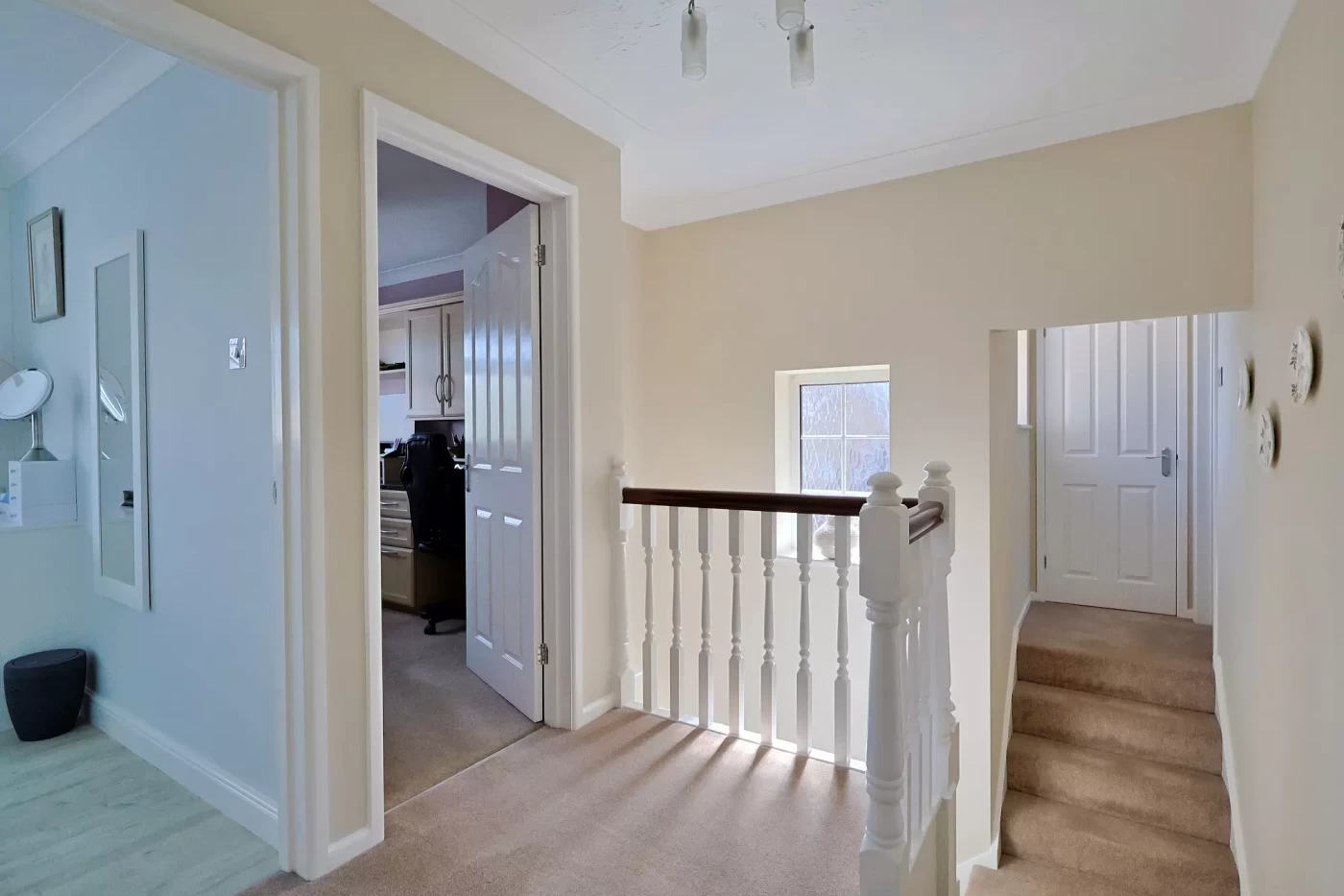 The first floor offers a spacious landing and five well-proportioned bedrooms. The main bedroom benefits from a comprehensive range of fitted wardrobes and bedroom furniture, along with a two-piece ensuite shower room.
