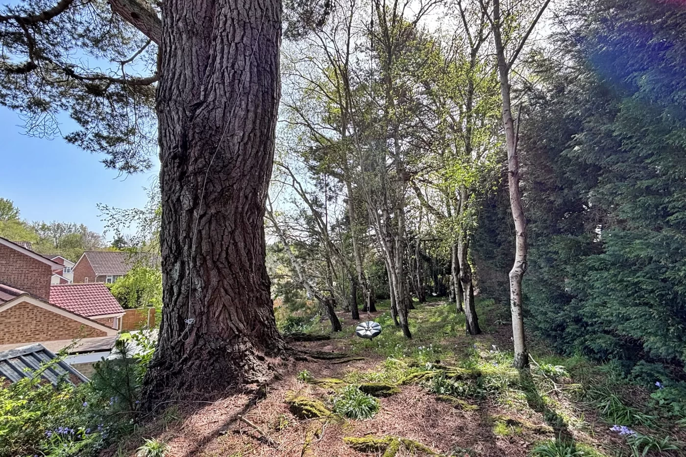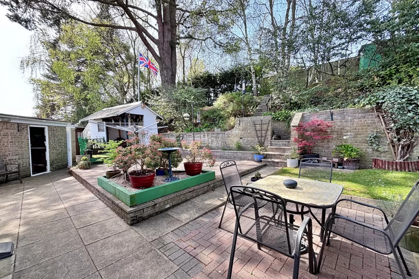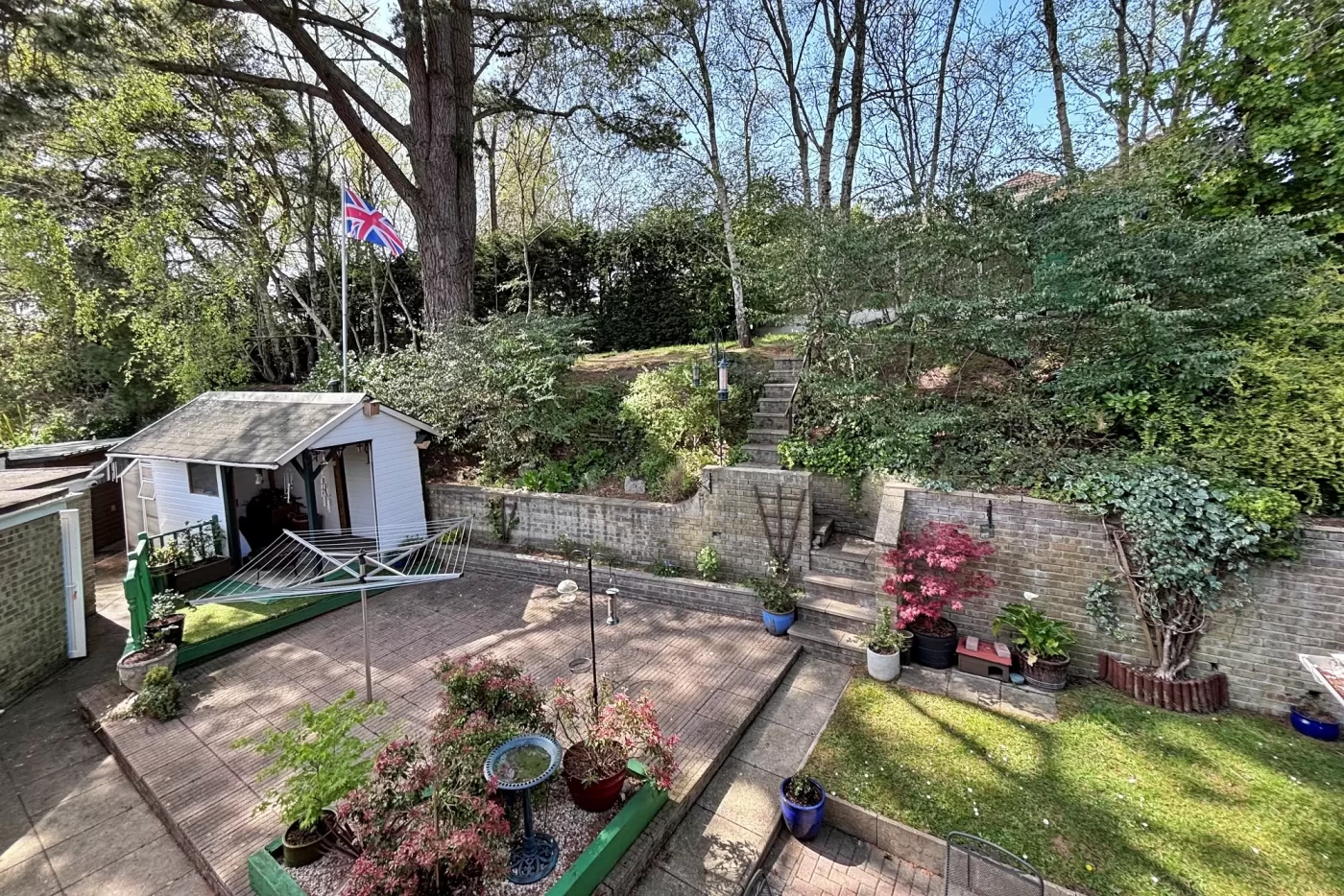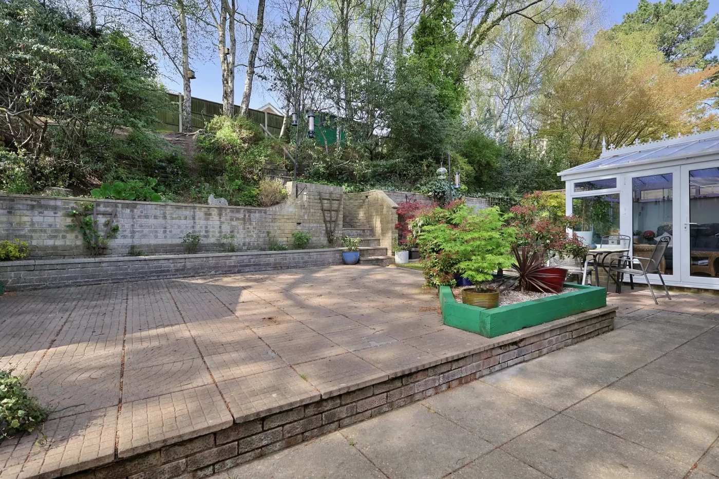 The rear garden has been thoughtfully landscaped, featuring a large patio terrace extending across the rear of the house, perfect for outdoor dining and entertaining. The main lawn area leads to a raised section of garden, predominantly laid to woodland with mature trees, creating a private and natural backdrop.