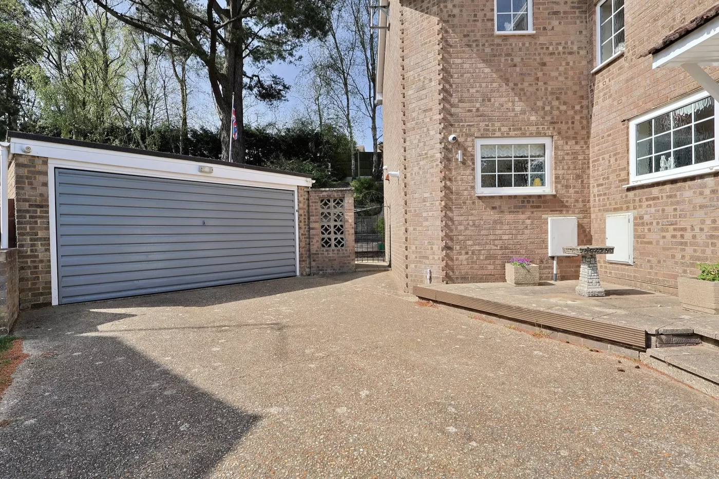 The property sits on a generous corner plot, providing driveway parking for several vehicles and access to a detached double garage. The garage benefits from an electric up-and-over door, with a useful workshop to the rear and an additional separate storeroom—ideal for hobbies or further storage.