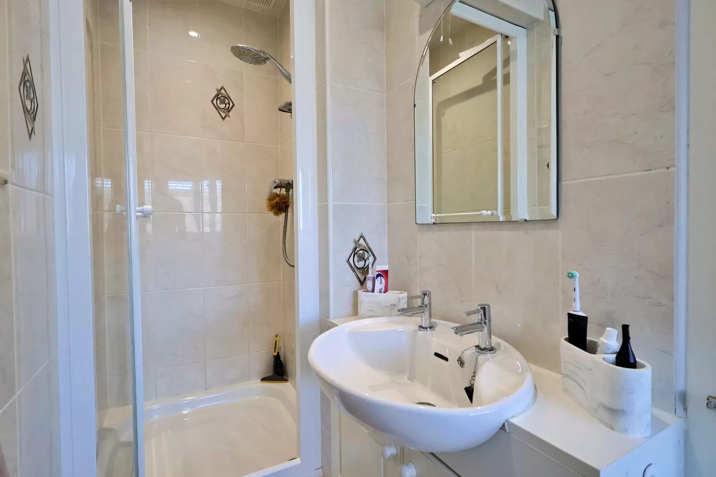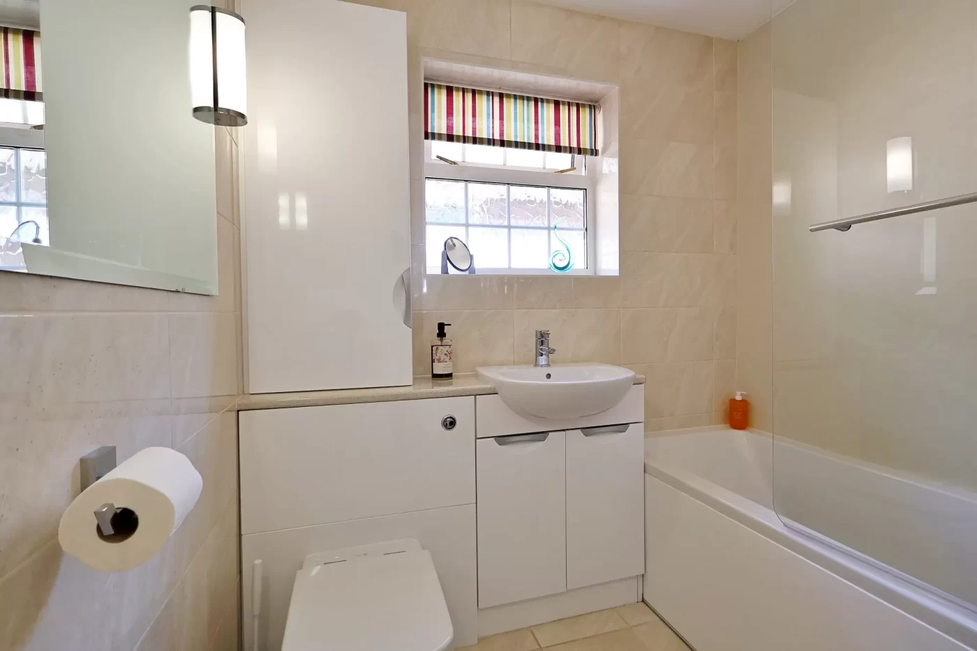 The family bathroom is fitted with a modern white three-piece suite, including a bath with shower over.