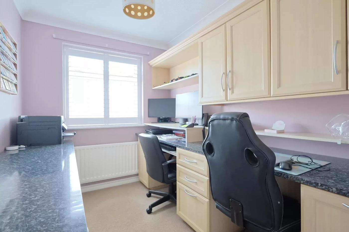 Bedrooms two and three also feature built-in wardrobes, while bedroom five is currently arranged as a home office with fitted office furniture, offering flexibility for those working from home.