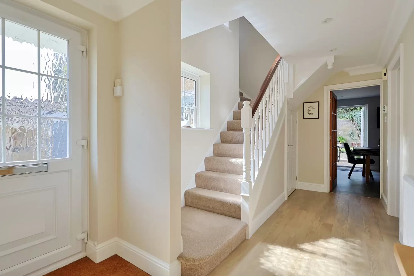 A welcoming reception hall provides an immediate sense of space, with stairs rising to the first floor and a useful fitted cupboard beneath.
