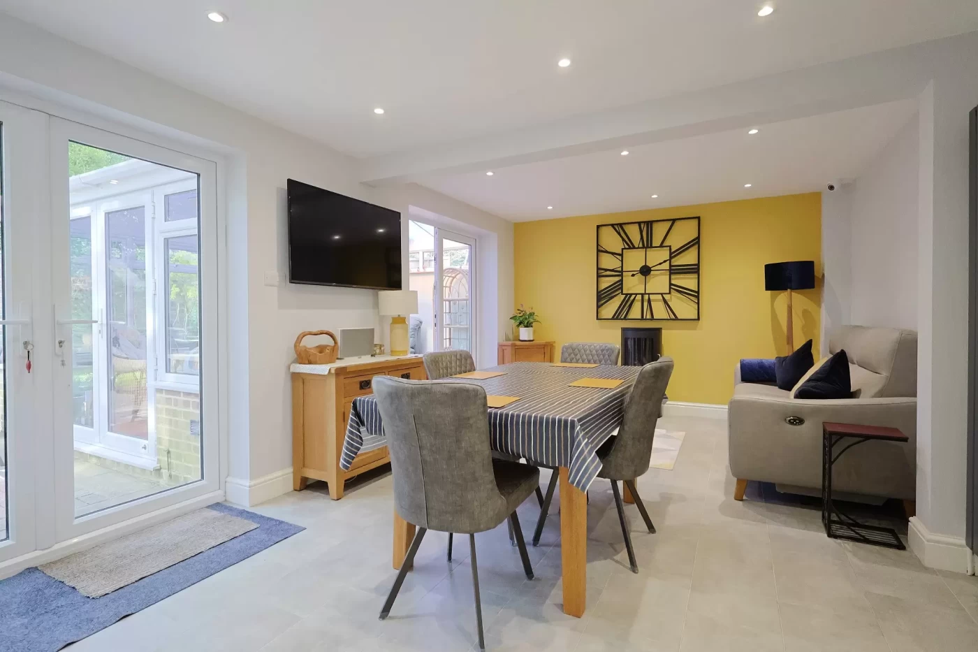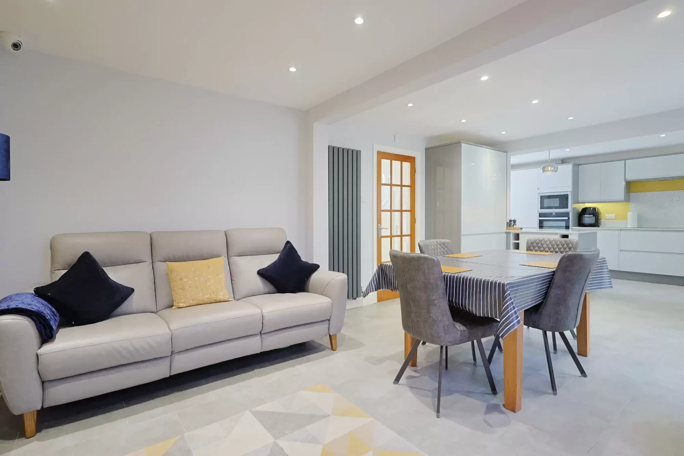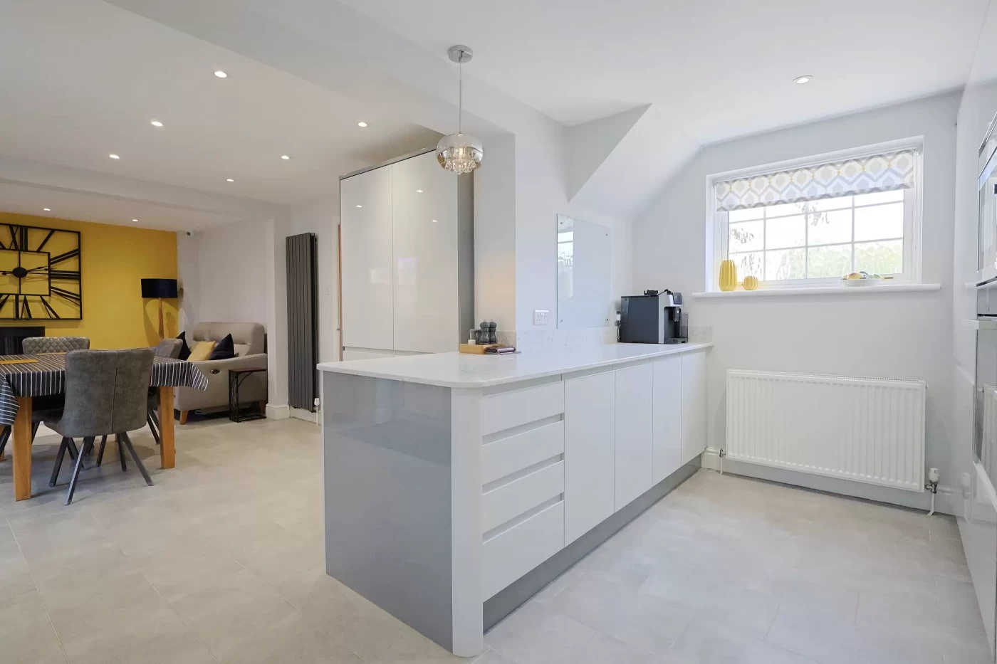 Undoubtedly the heart of the home is the superb extended open-plan kitchen/dining/family area, spanning the rear of the property. This contemporary space is ideal for both everyday living and entertaining, with french doors opening directly onto the garden. The kitchen is well-appointed with an extensive range of base and eye-level units, complemented by integrated appliances including a full-size fridge, separate freezer, oven, microwave, hob, washing machine, and dishwasher.