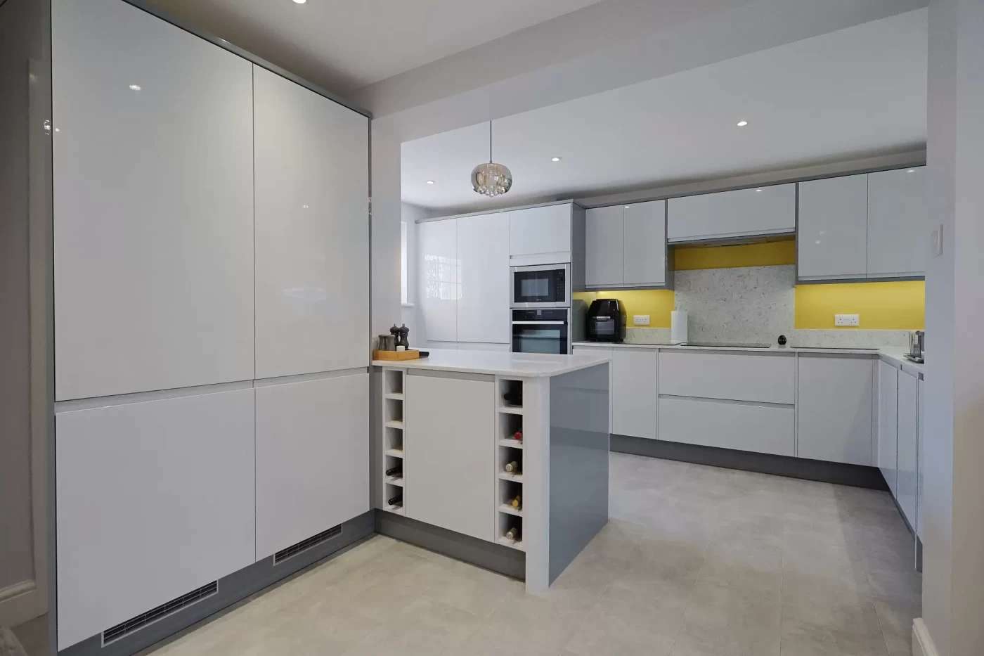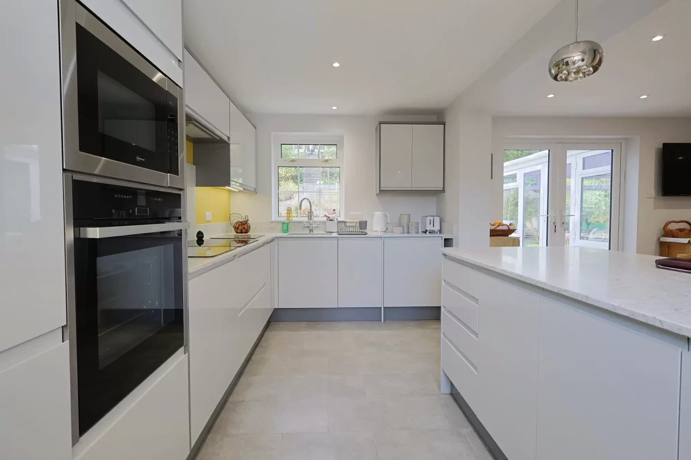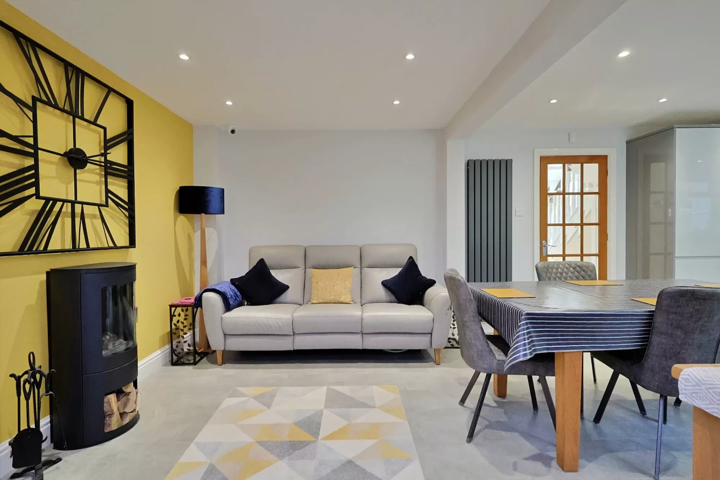 Undoubtedly the heart of the home is the superb extended open-plan kitchen/dining/family area, spanning the rear of the property. This contemporary space is ideal for both everyday living and entertaining, with french doors opening directly onto the garden. The kitchen is well-appointed with an extensive range of base and eye-level units, complemented by integrated appliances including a full-size fridge, separate freezer, oven, microwave, hob, washing machine, and dishwasher.