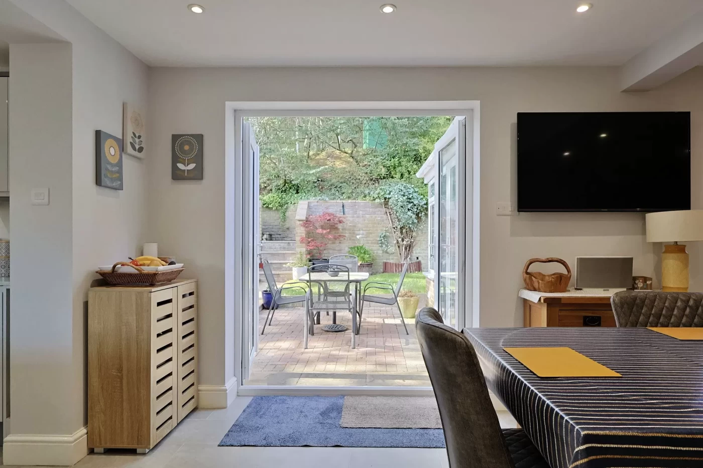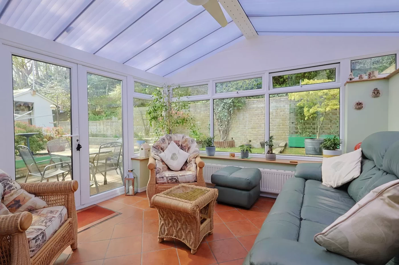 Double doors lead through to a conservatory, offering further reception space and pleasant views across the garden. A cloakroom completes the ground floor accommodation, fitted with a WC, wash hand basin, and a concealed water softener.