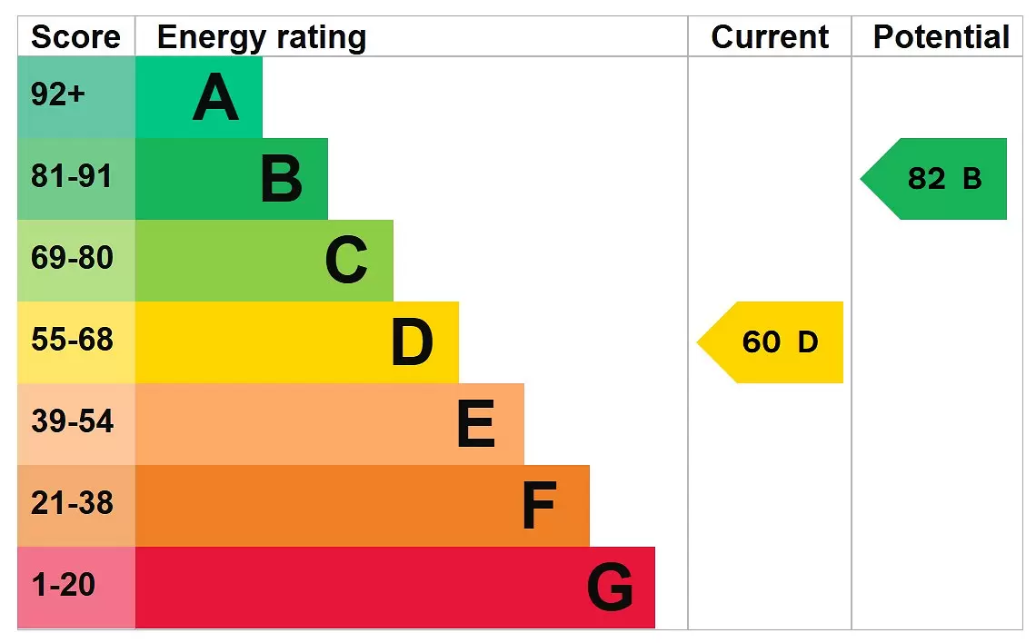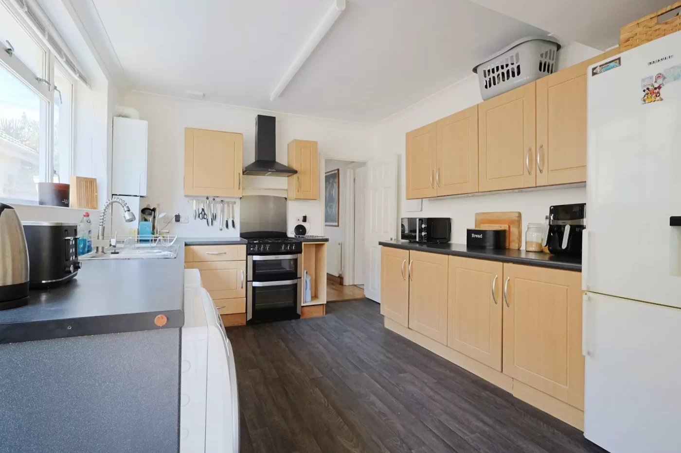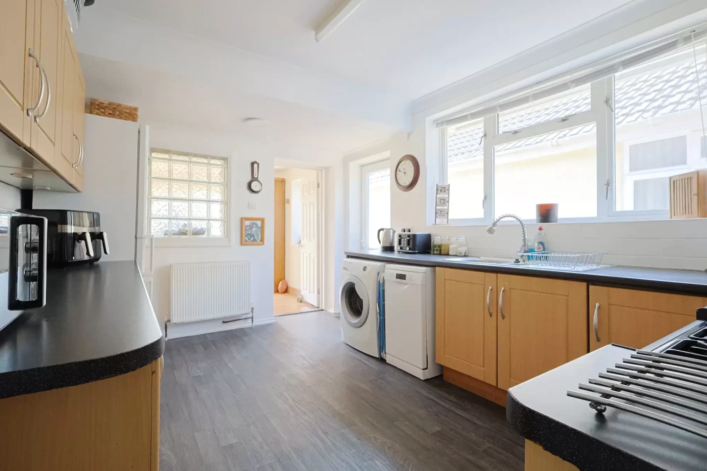 The property is accessed via an entrance hall. The kitchen is generously proportioned and fitted with a comprehensive range of base and eye-level units, complemented by ample work surfaces. A side door and window provide natural light and convenient external access. A range of kitchen appliances are available, subject to negotiation.