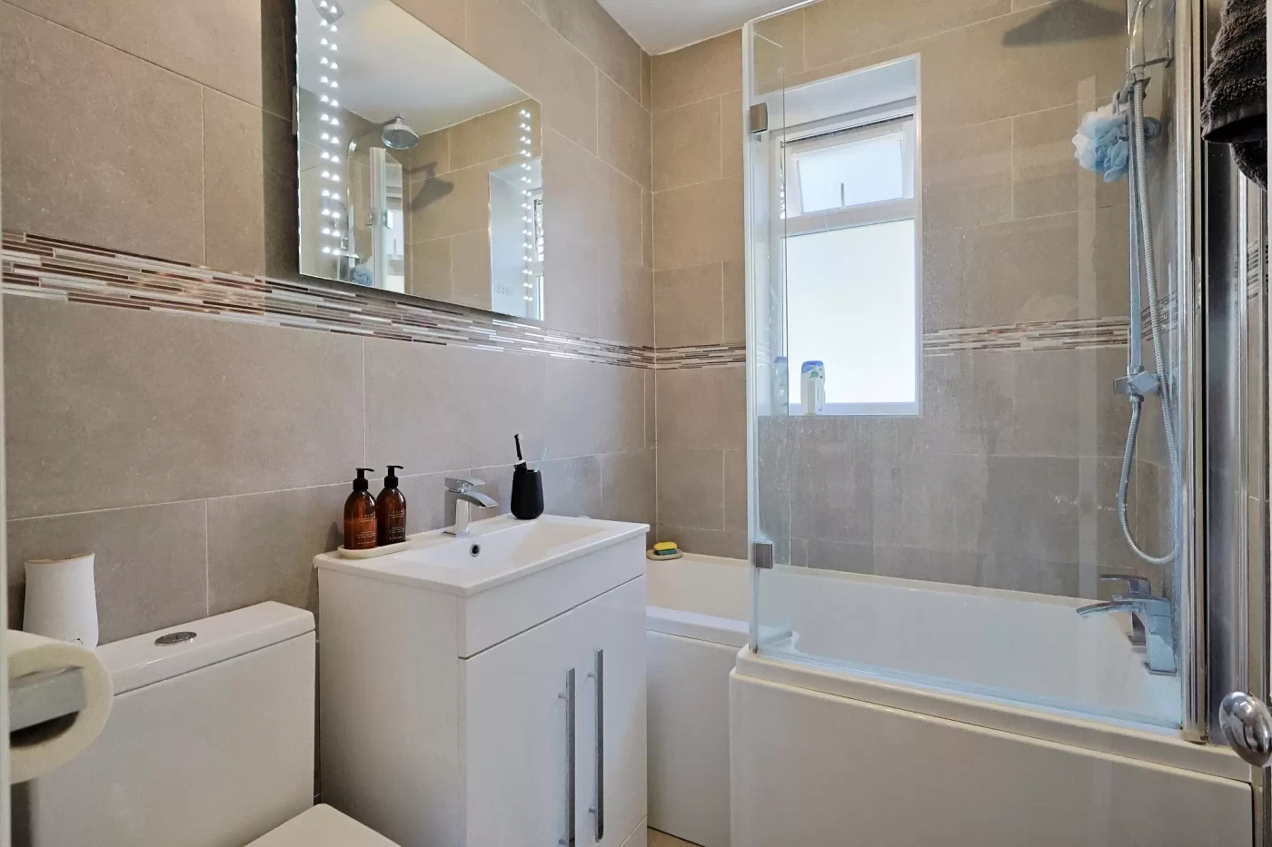 The family bathroom is modern in design and fitted with a white suite comprising a panelled bath with shower over, WC, and wash hand basin.