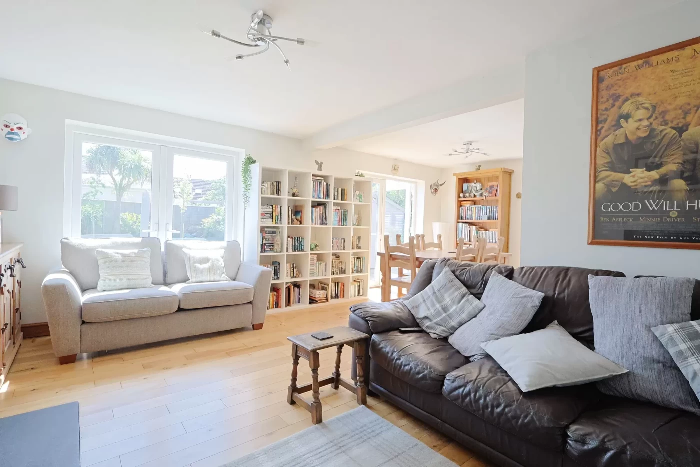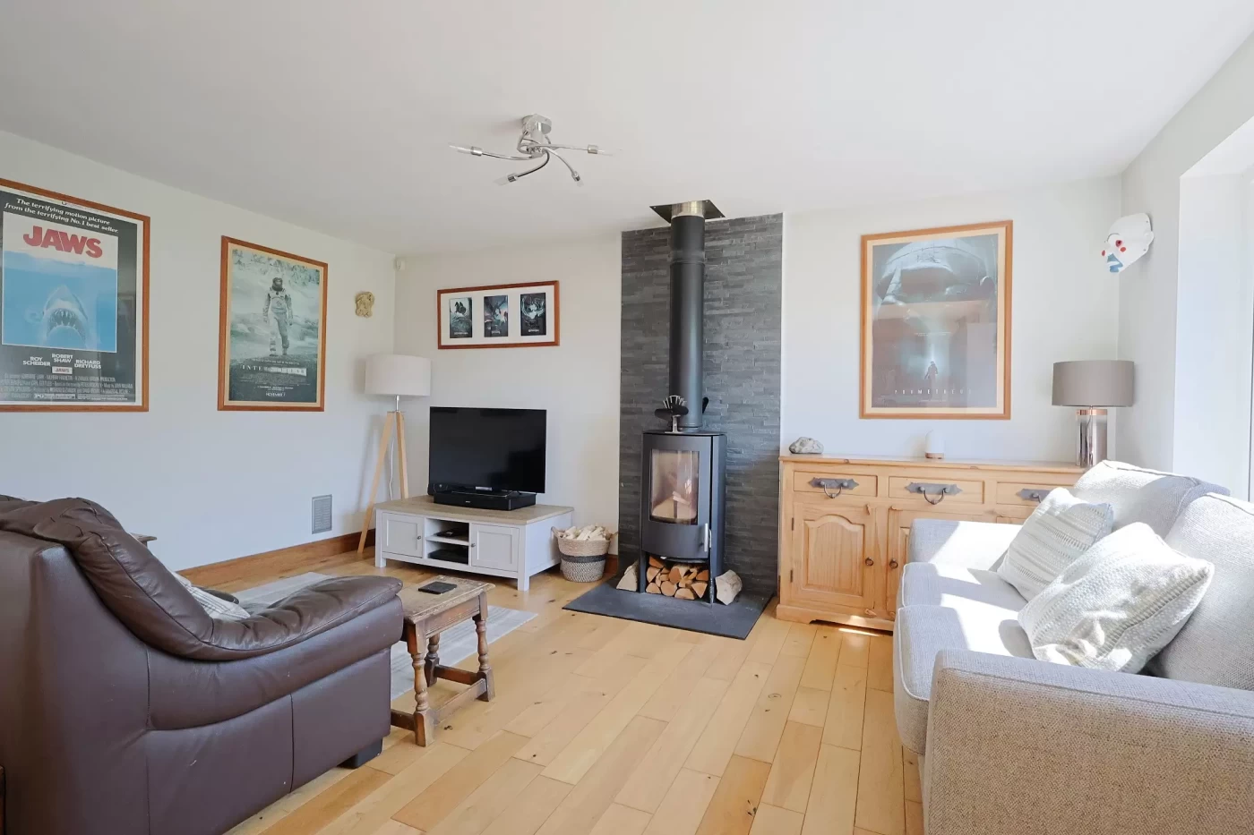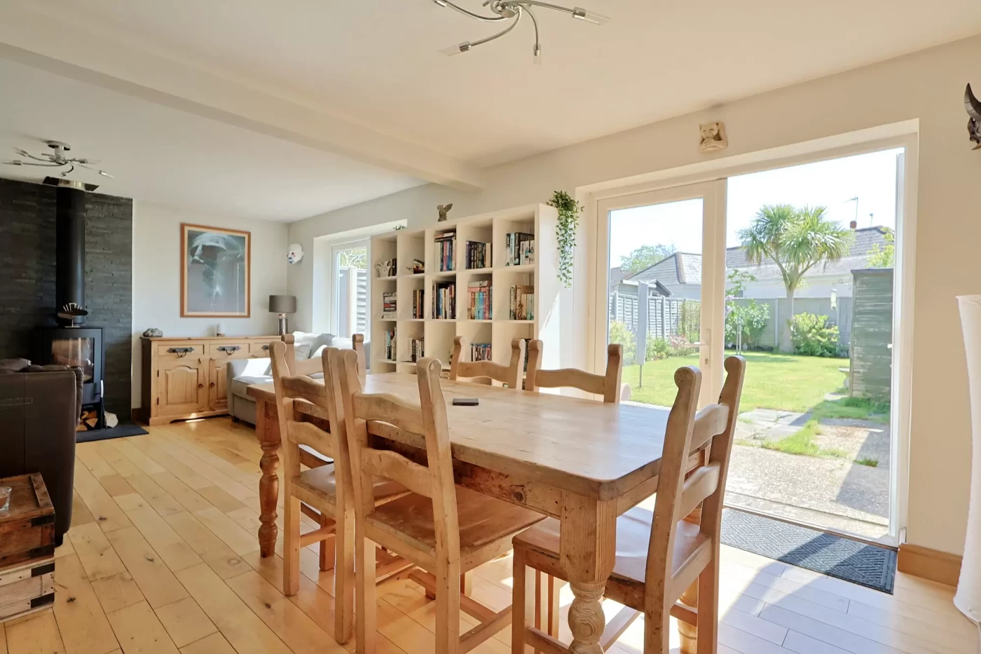 Positioned across the rear of the property is an impressive L-shaped sitting/dining room, creating a superb living and entertaining space. French doors open directly onto the rear garden, allowing for a seamless indoor-outdoor flow, while a feature wood burner provides a cosy focal point.