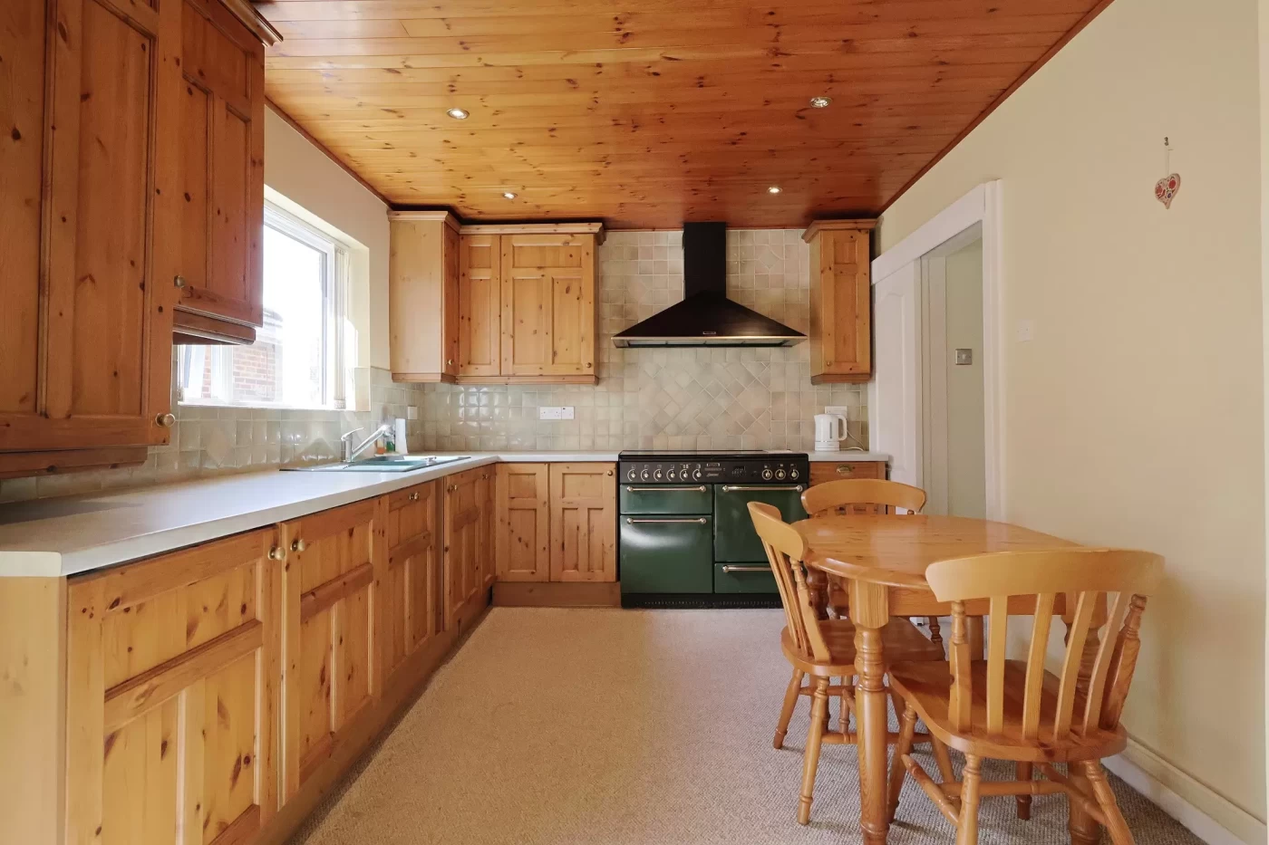 The kitchen/dining room is generously proportioned and fitted with a range of units and built-in appliances, including a fridge, washing machine and a dishwasher together with a range cooker. There is ample space for a dining table, making it ideal for both everyday living and entertaining.