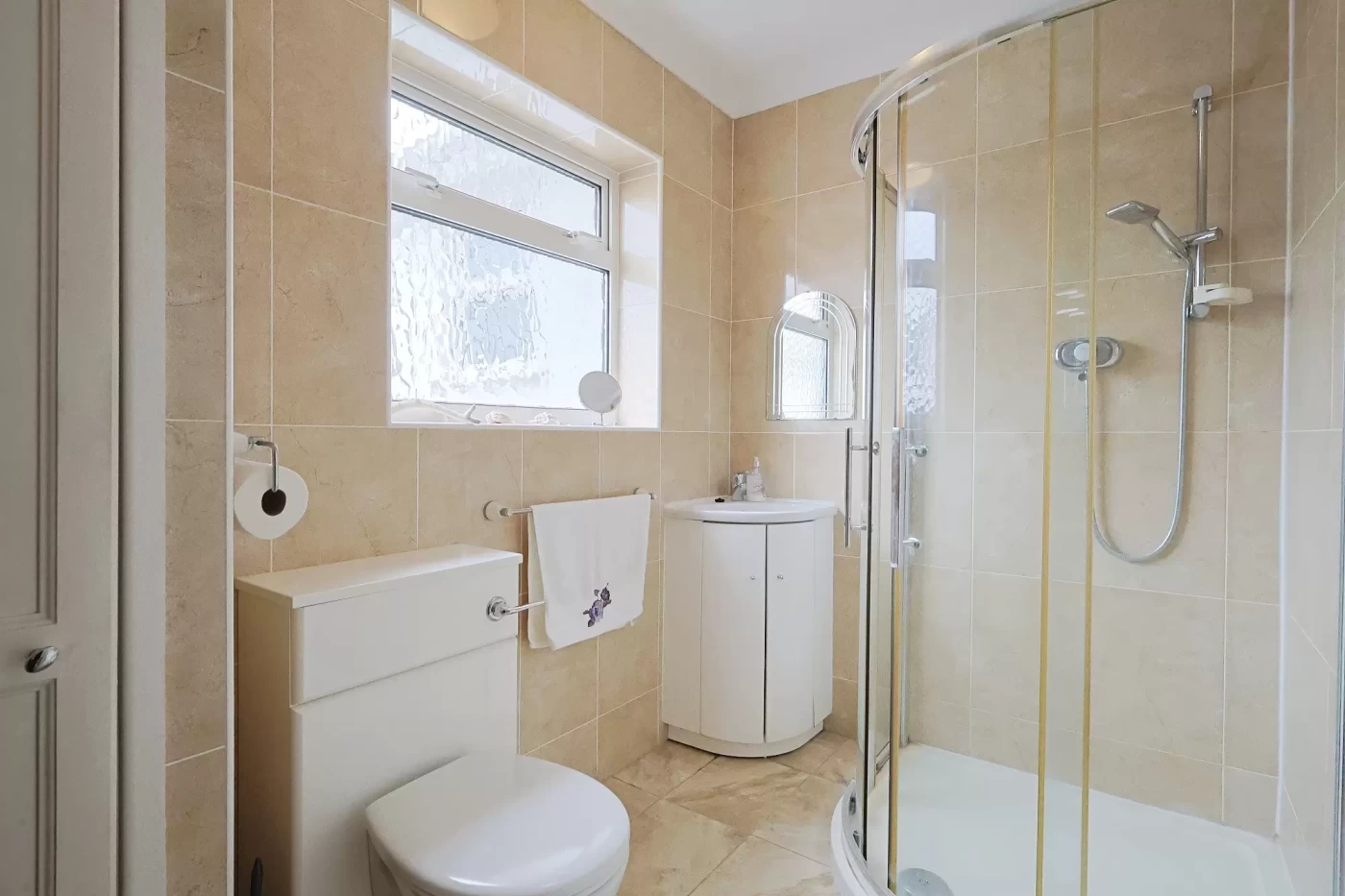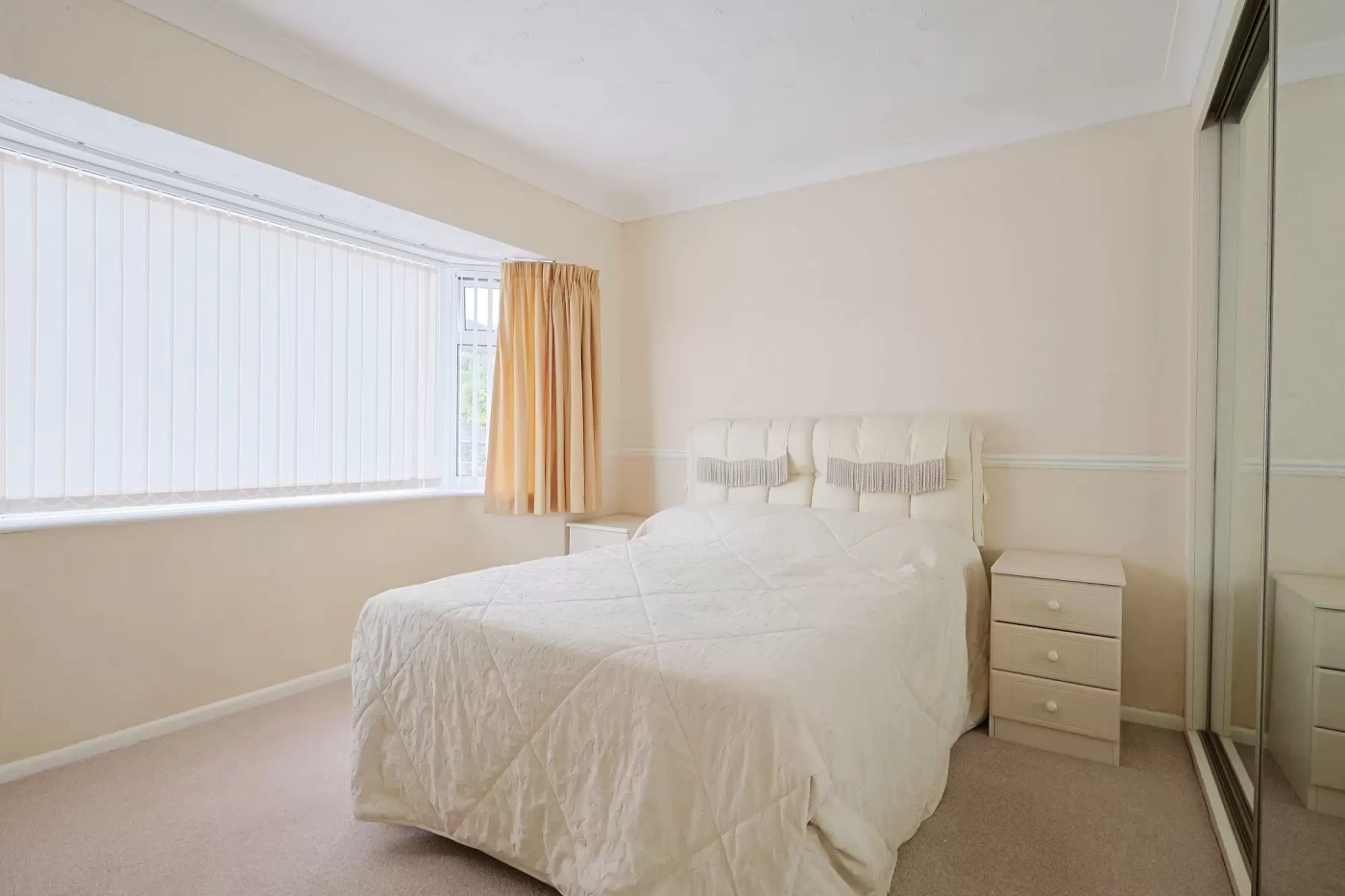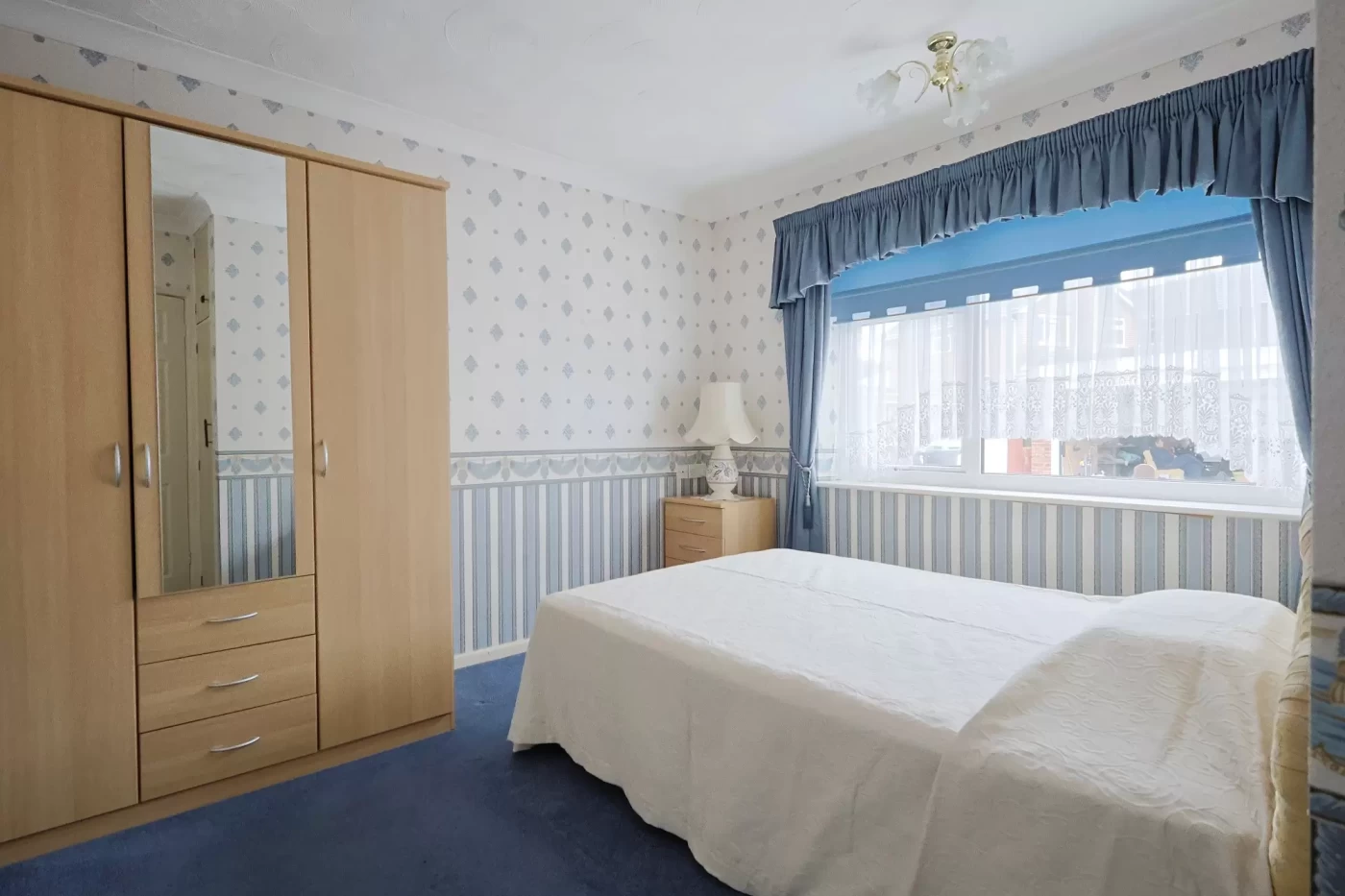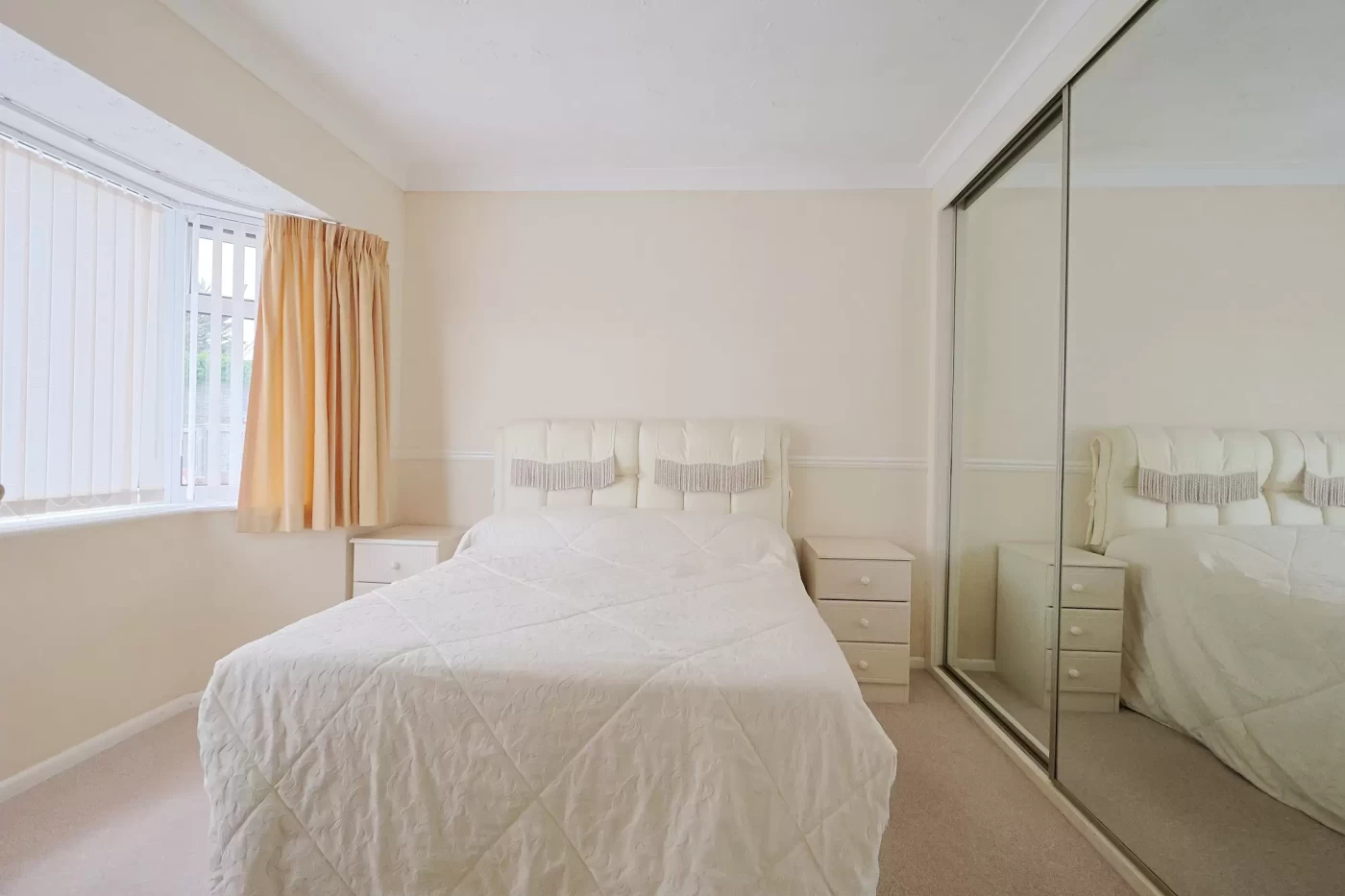 The bungalow offers two well-proportioned double bedrooms, with the principal bedroom featuring a range of built-in wardrobes with mirrored sliding doors. The shower room is fitted with a modern white three-piece suite and benefits from a useful built-in linen cupboard.